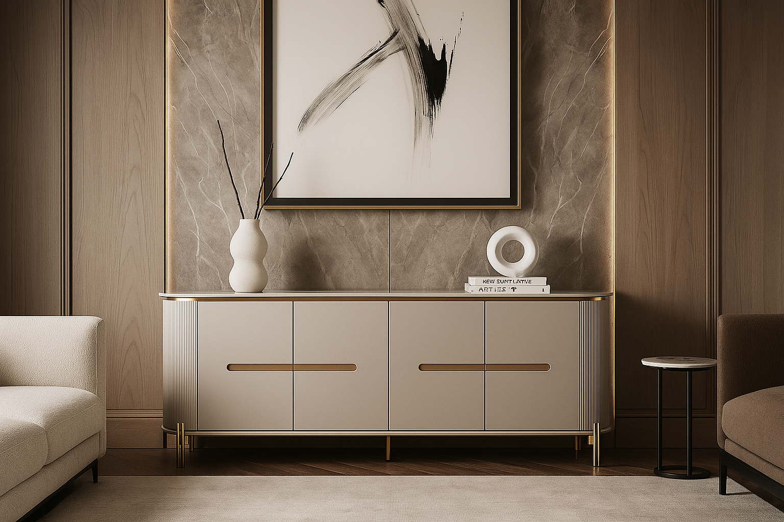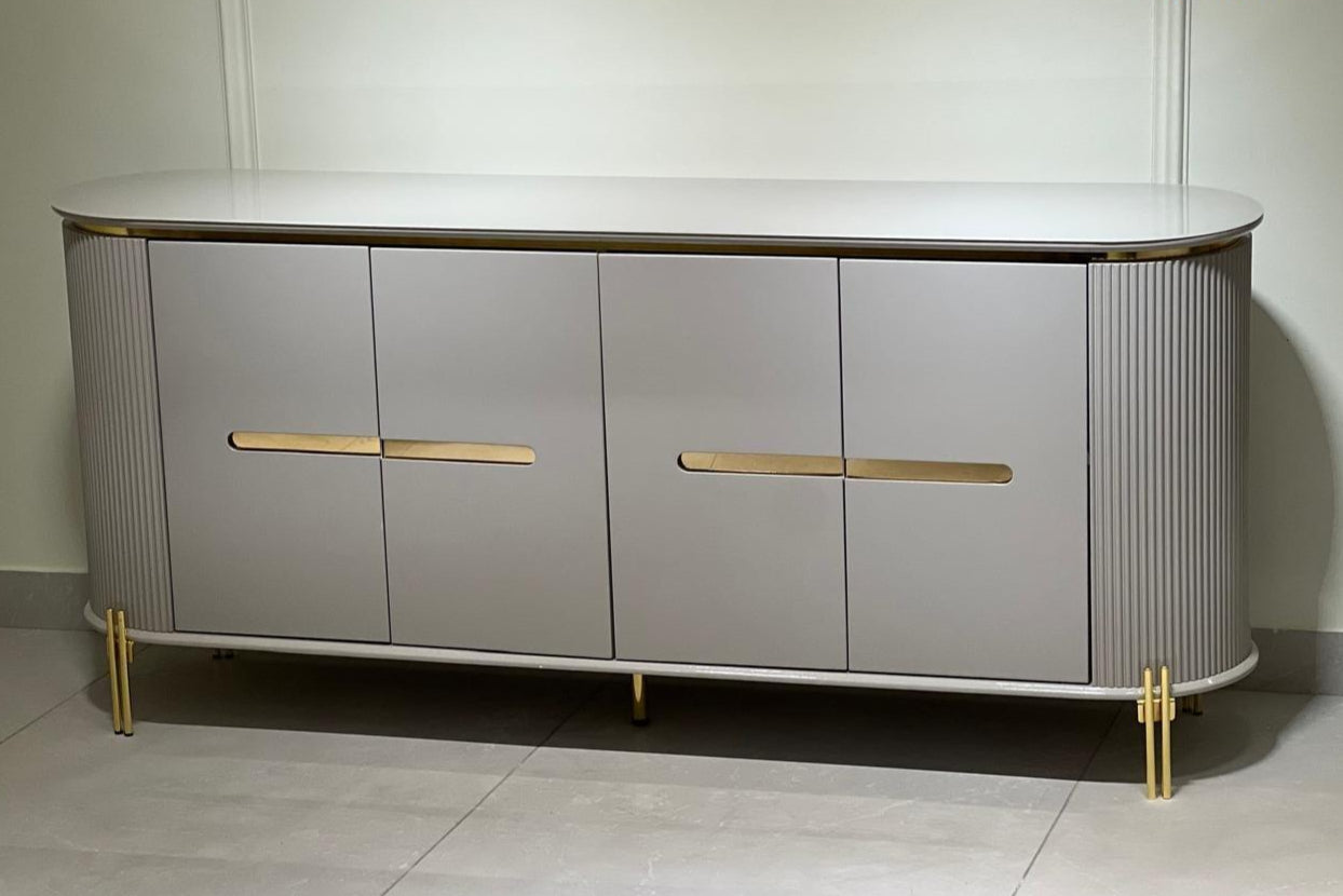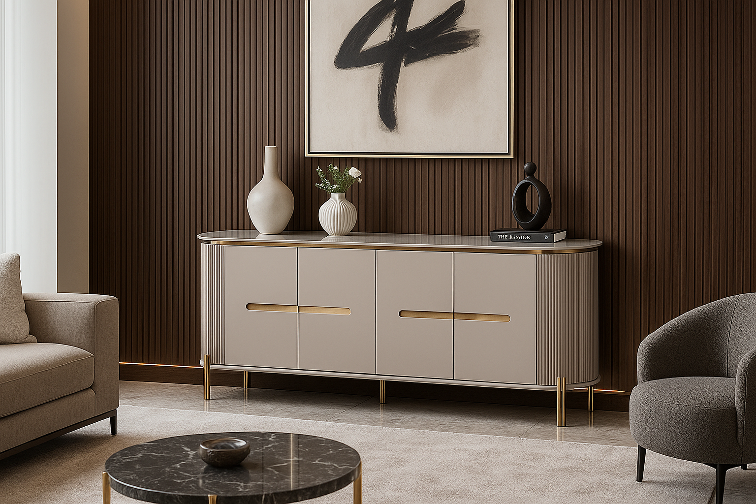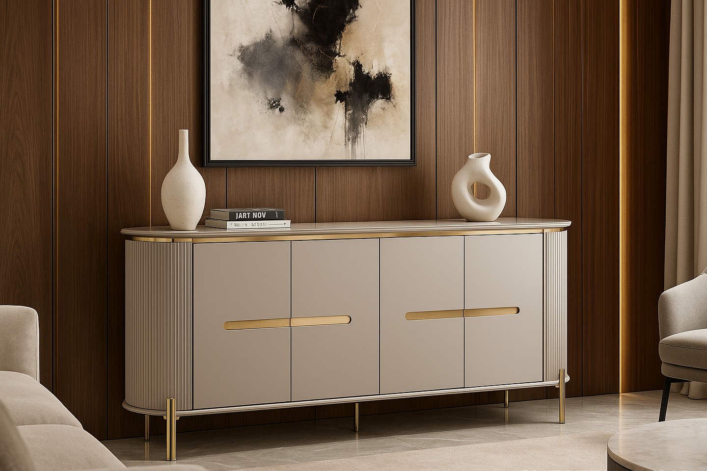 Luxury beige Chester sideboard with satin-gold accents and fluted detailing. A refined storage console for dining or living spaces by TAS Living.