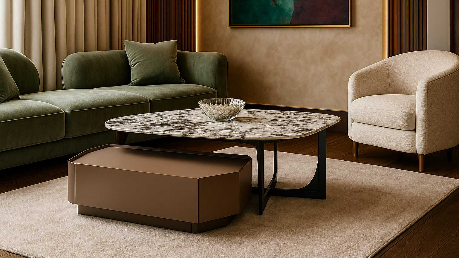 Astra Marquina Center Coffee Table —a modern marble and metal designer coffee table set. TAS Living premium furniture collection.