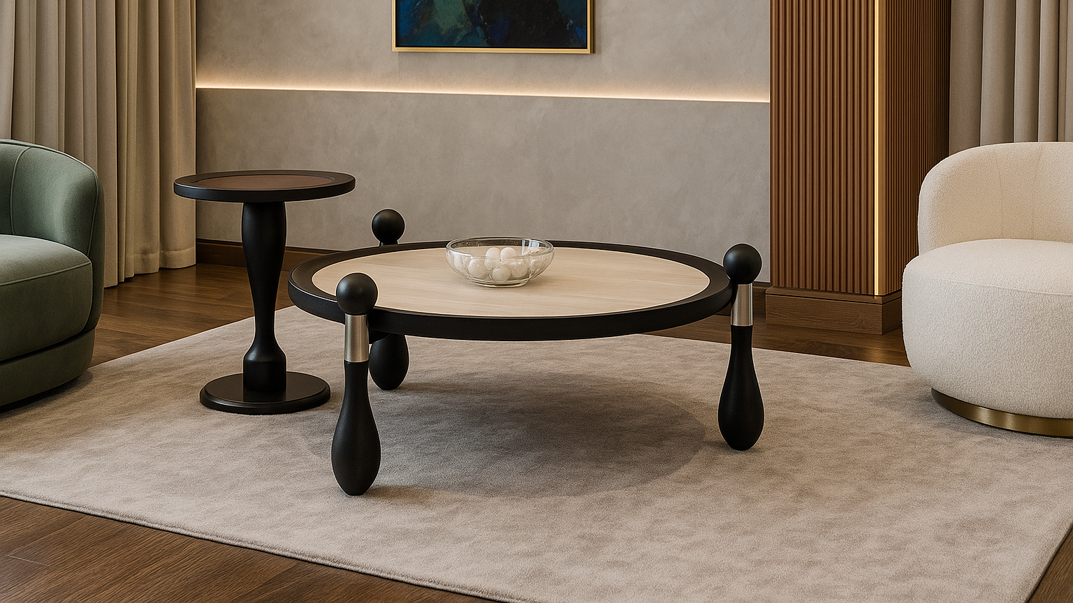 Sculptural round center coffee table with cream top and orb legs—artful modern luxury for expressive contemporary spaces.