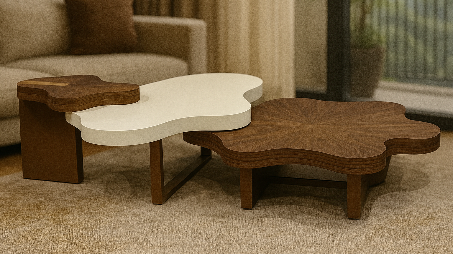 Three-tier organic center coffee table in walnut and ivory lacquer—fluid design meets sculptural luxury.