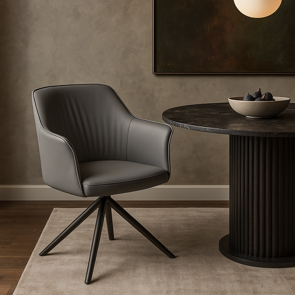 Slate grey Dinning chair with curved arms and matte-black legs — ideal for luxury dining, lounge, or office settings.