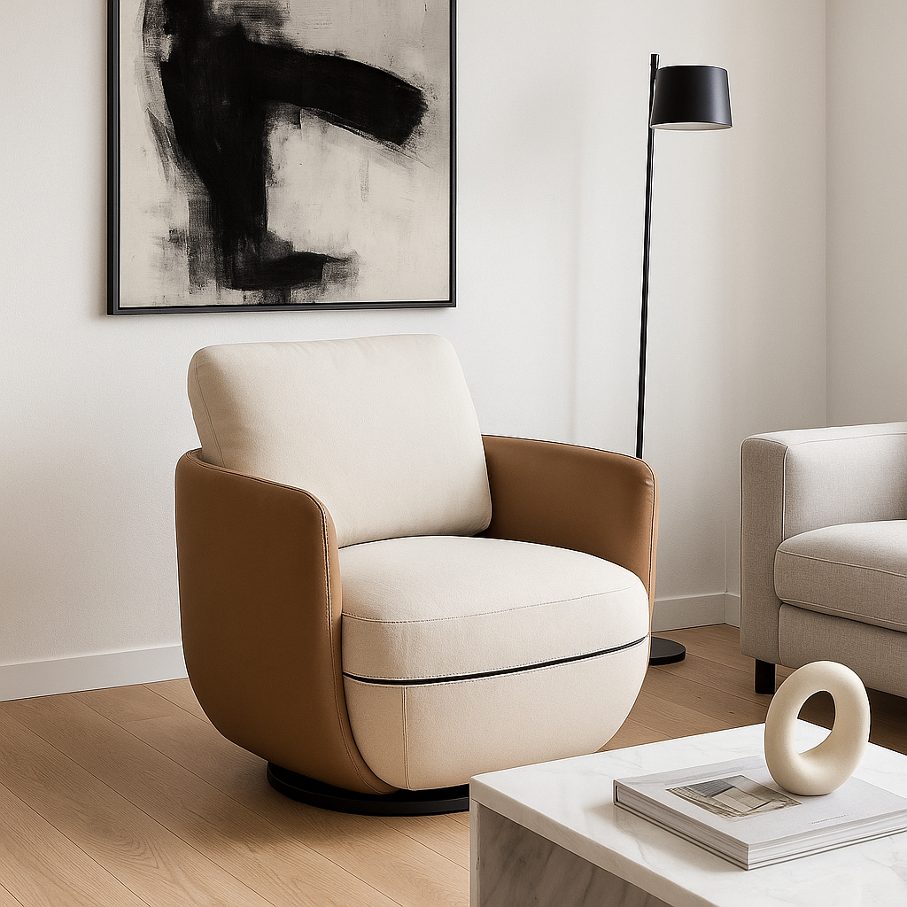 Poltrona Urbane is a modern swivel lounge chair combining soft ivory upholstery with warm tan leather, designed for luxurious urban living.