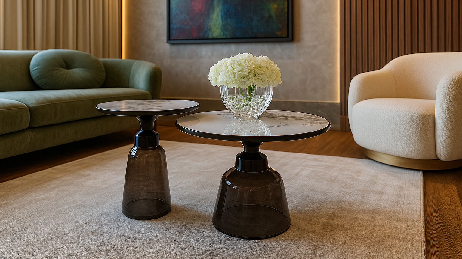 Elevate your living space with our luxury Noir Eclat Marble Centre coffee Table, featuring a premium marble top and sleek smoked glass base.