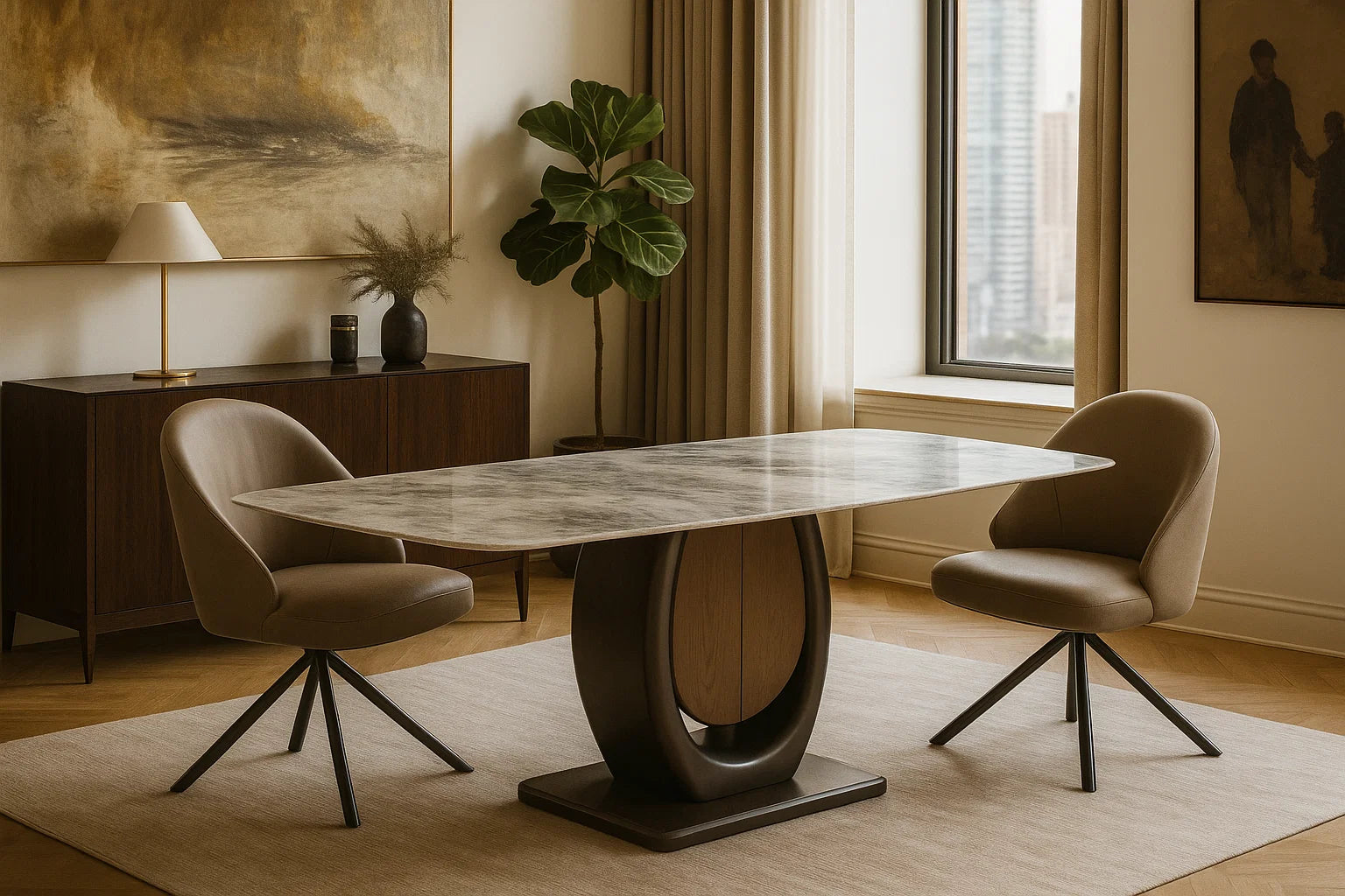 Elegant oval marble dining table with sculptural base and chairs — a refined centrepiece for luxury dining spaces.