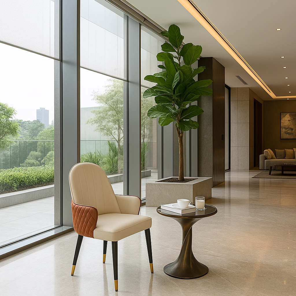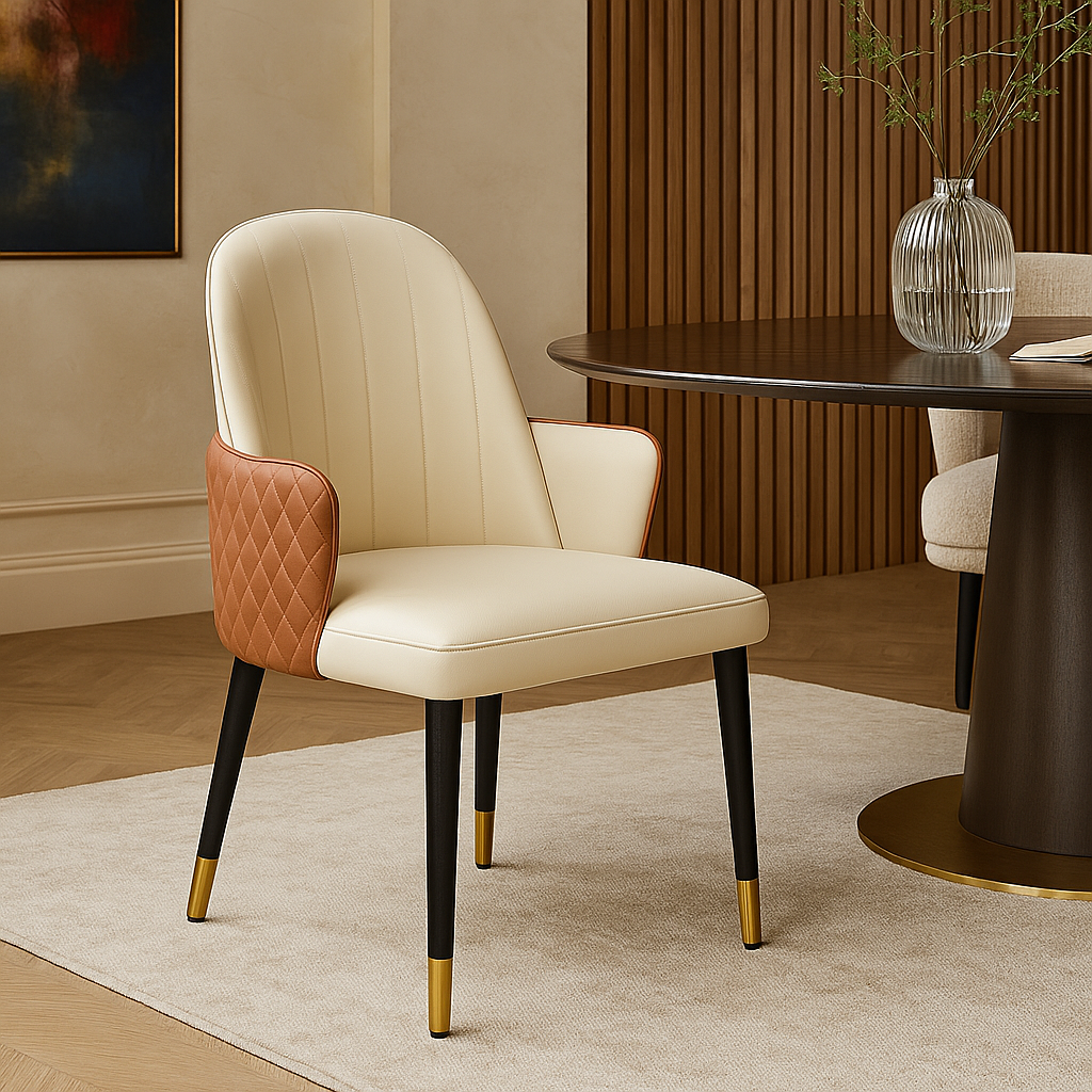 Saffron Indigo Dining Chair in dual-tone leatherette with quilted arm panels and gold-tipped legs — bold modern luxury for dining or lounge.