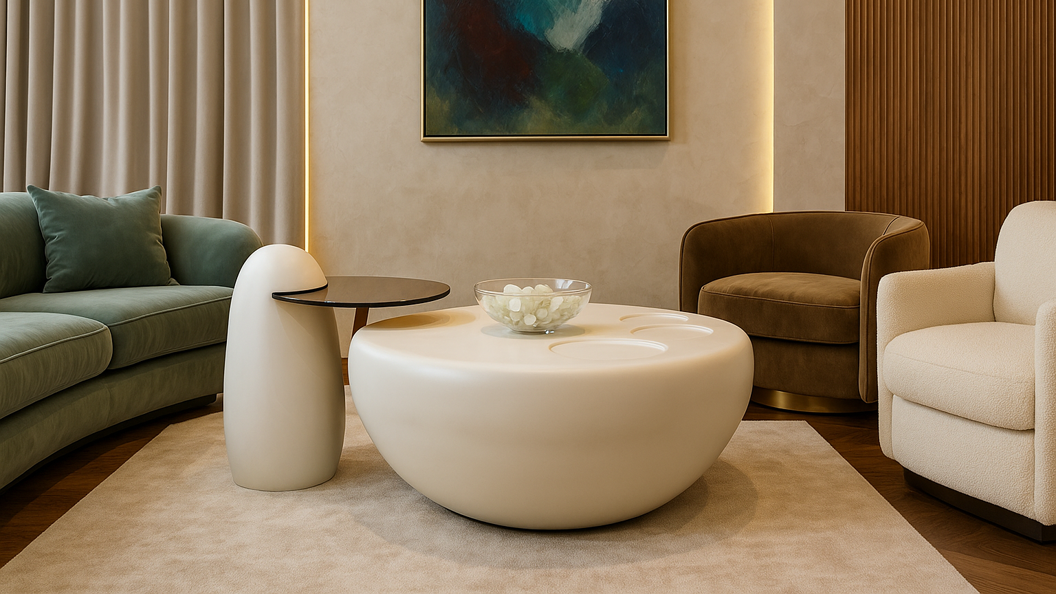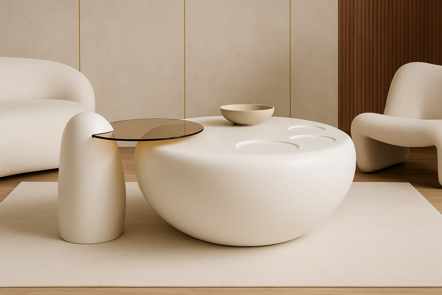 Ultra-modern sculptural white and bronze center coffee table set with organic curves, ideal for artful interiors.
