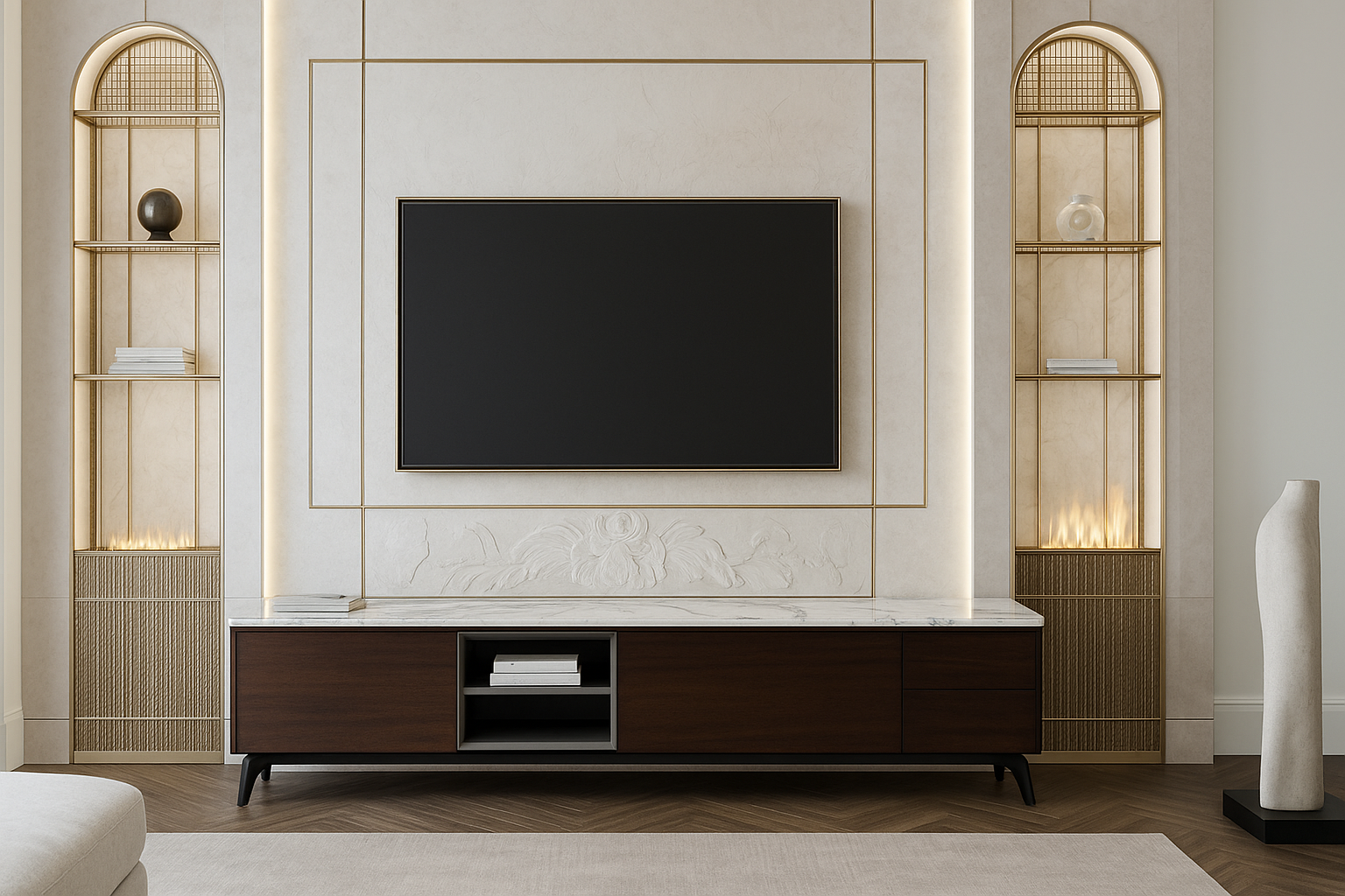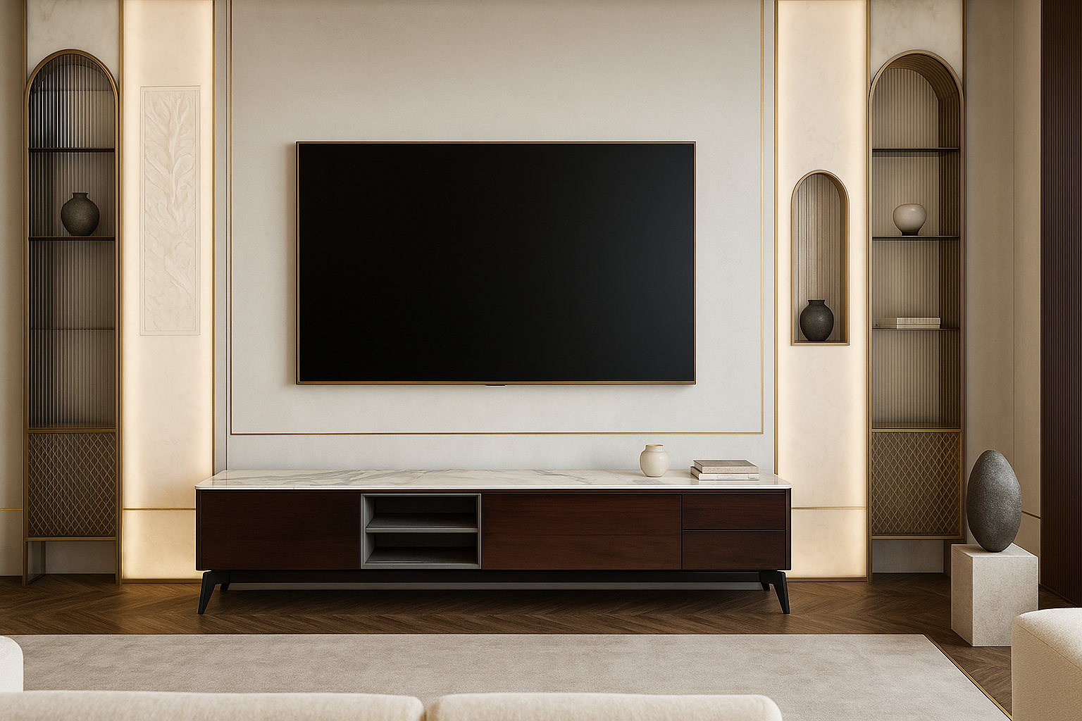 Elevate your interiors with the Caelis LED Runner — a dark-wood and veined marble TV unit combining artistry with storage elegance.