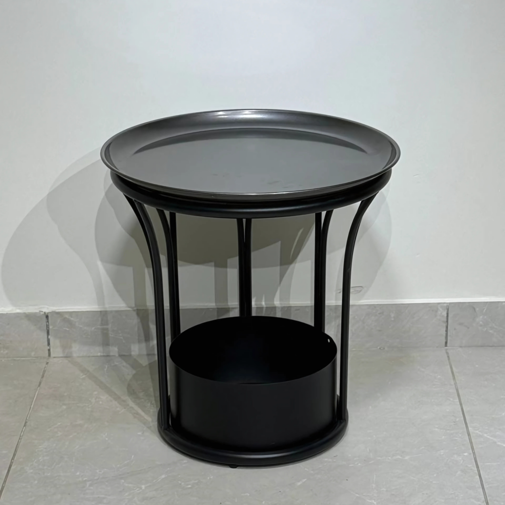 Noir Haven black metal side table with storage – modern, durable, and perfect for living spaces. Elegant design with round top & functional base