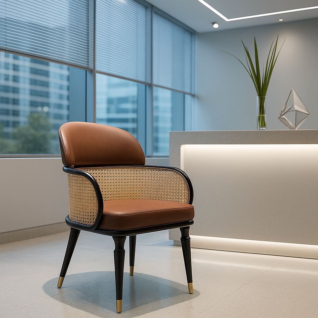 Luxury dining chair with woven cane back, brown leatherette seat, and golden accents — elegant seating for refined interiors.
