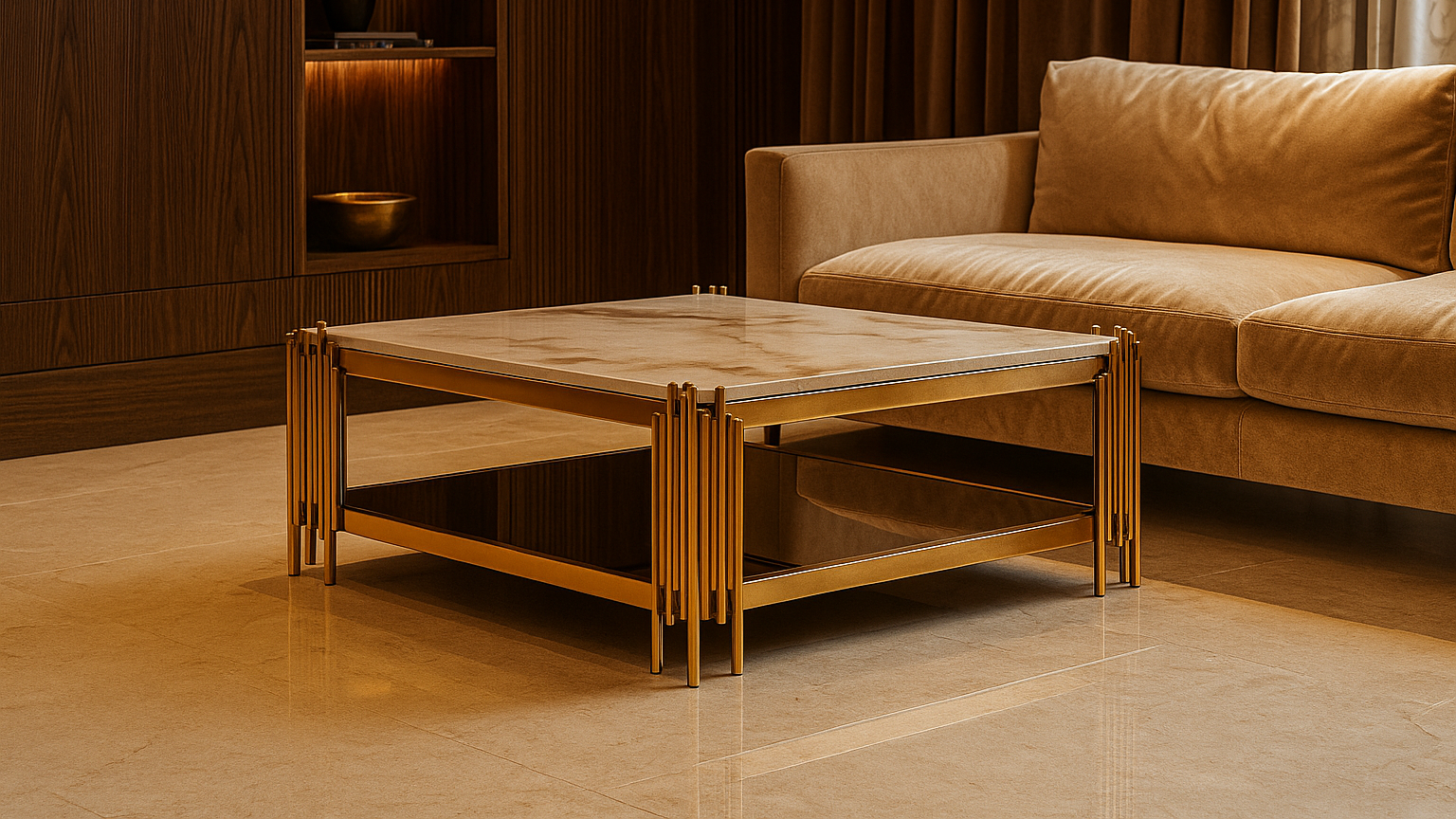 Luxury square marble and rose gold center coffee table with sculptural rods and shelf—crafted for refined modern spaces.