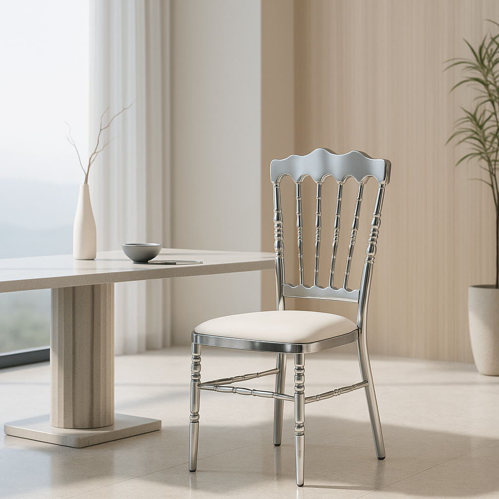 Elegant metallic gold chair with sculpted backrest and white cushion. A regal seating option ideal for weddings, banquets, and luxury dining spaces.