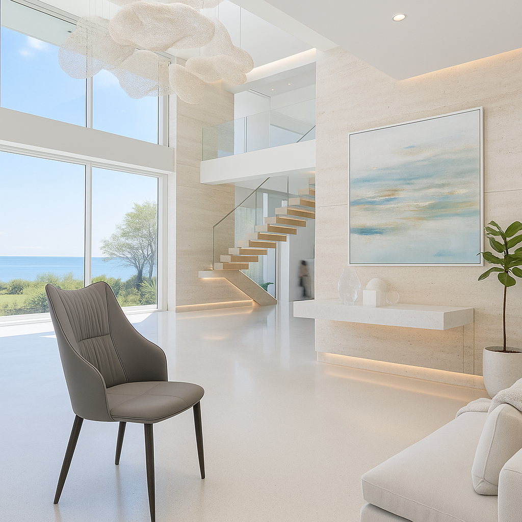 Sleek slate grey dining chair with pleated high back and tapered black legs — perfect for modern luxury dining.