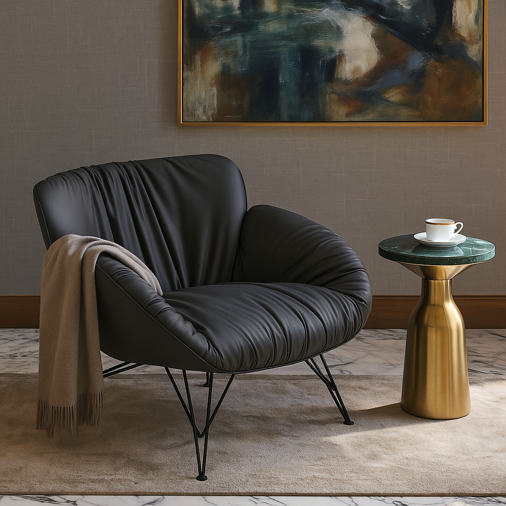 Slouch Leisure Lounge Chair, a unique ruched accent chair with a sculptural design. Perfect for bringing a modern, relaxed vibe to your living room.