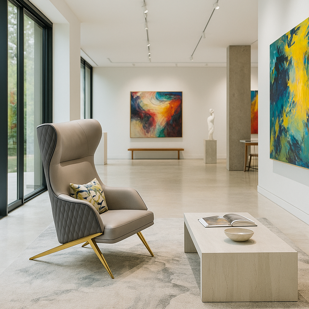 Sculptural grey wingback Leisure lounge chair with quilted detailing and gold legs — ideal for refined living rooms or offices.