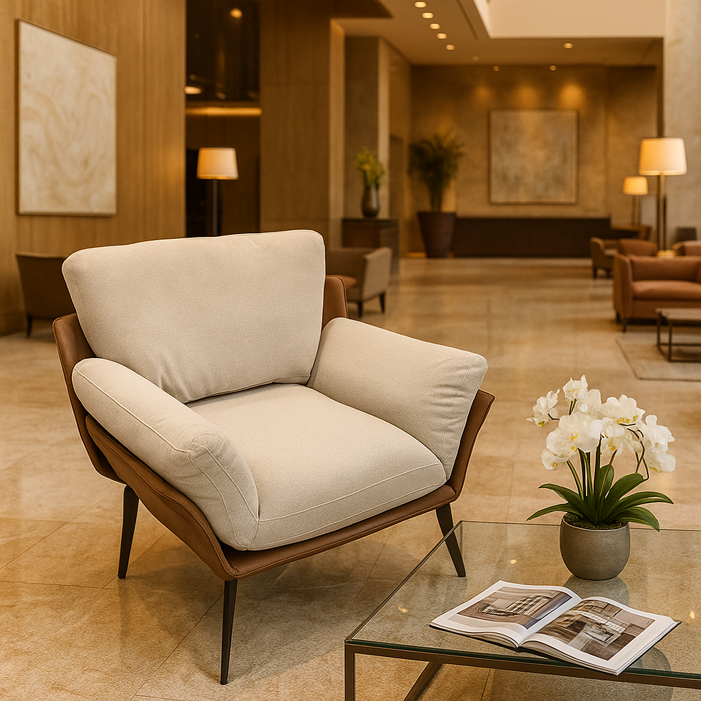 Elegant leisure lounge chair with cream upholstery, sculpted brown shell, and slim black legs — crafted for everyday luxury.