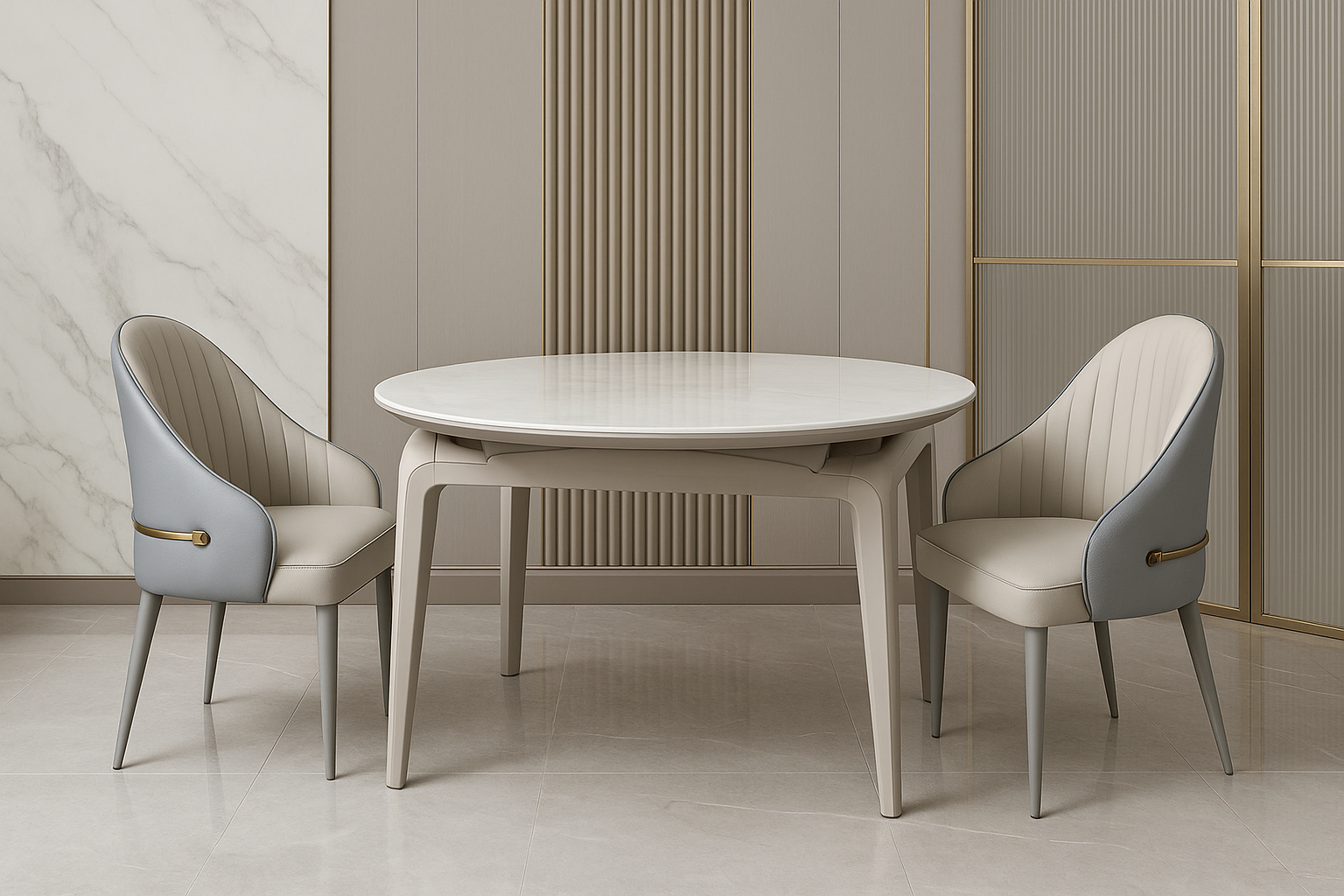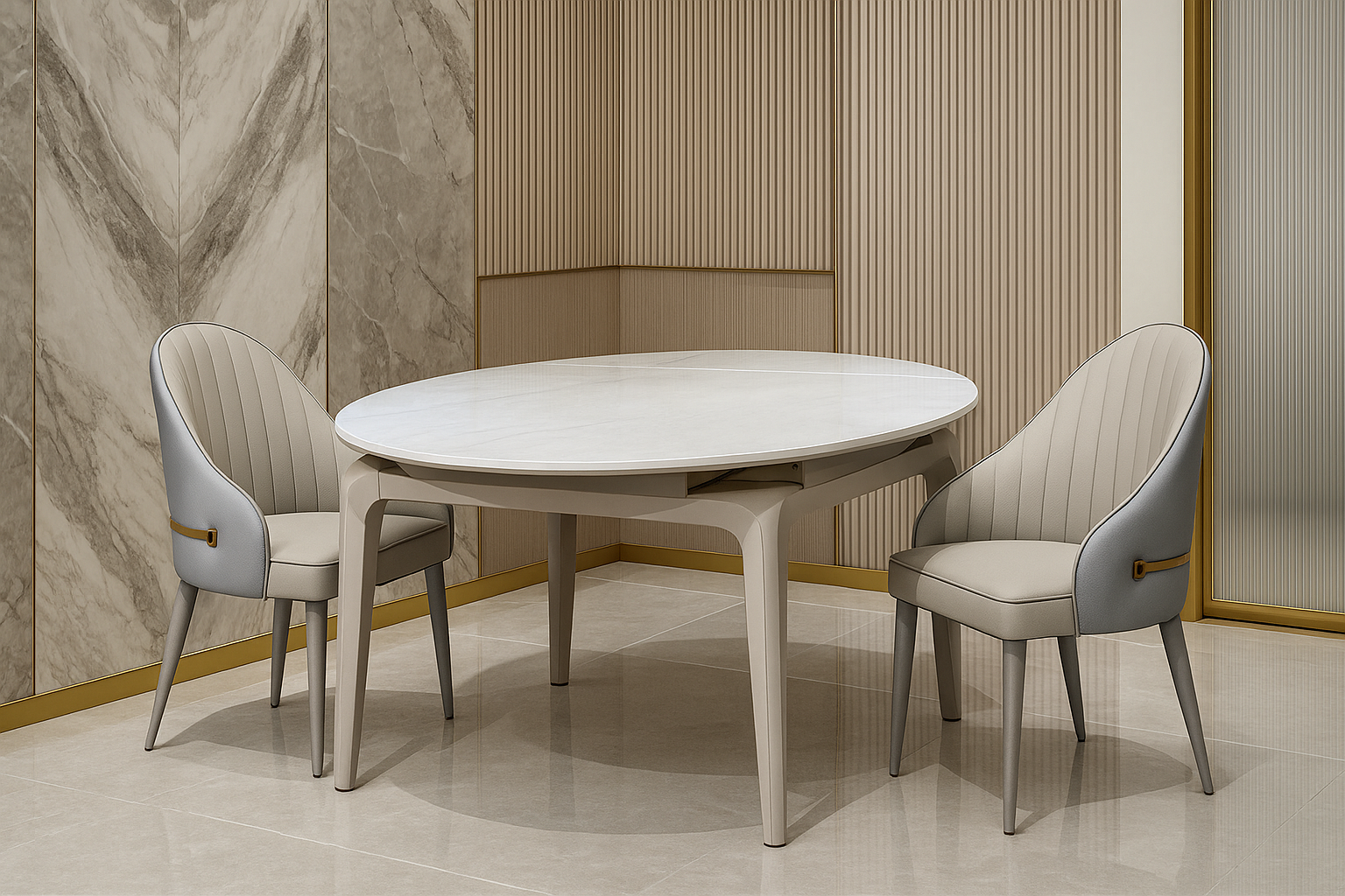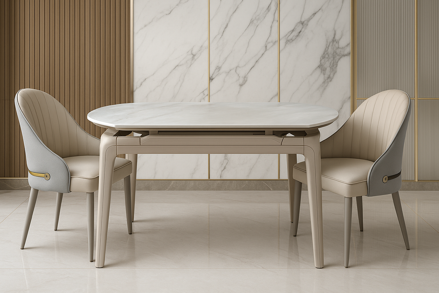 Luxury extendable ivory dining table with dual-tone leatherette chairs and satin finish — functional elegance for high-end modern interiors.