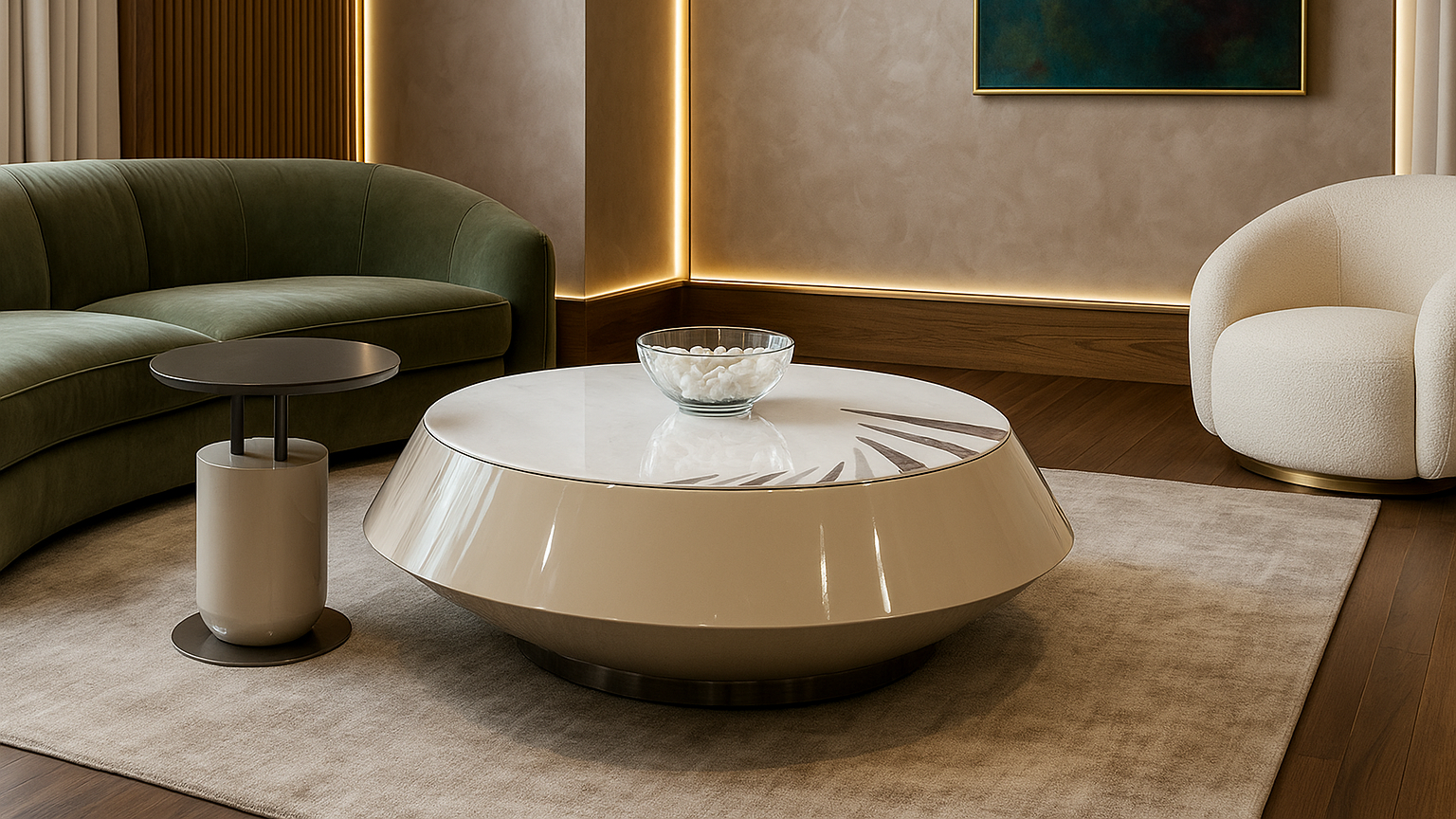 Velour Stone Center Coffee Table Set – a futuristic design with a glossy beige body, white marble top, and geometric pattern detailing. Perfect for modern luxury interiors.