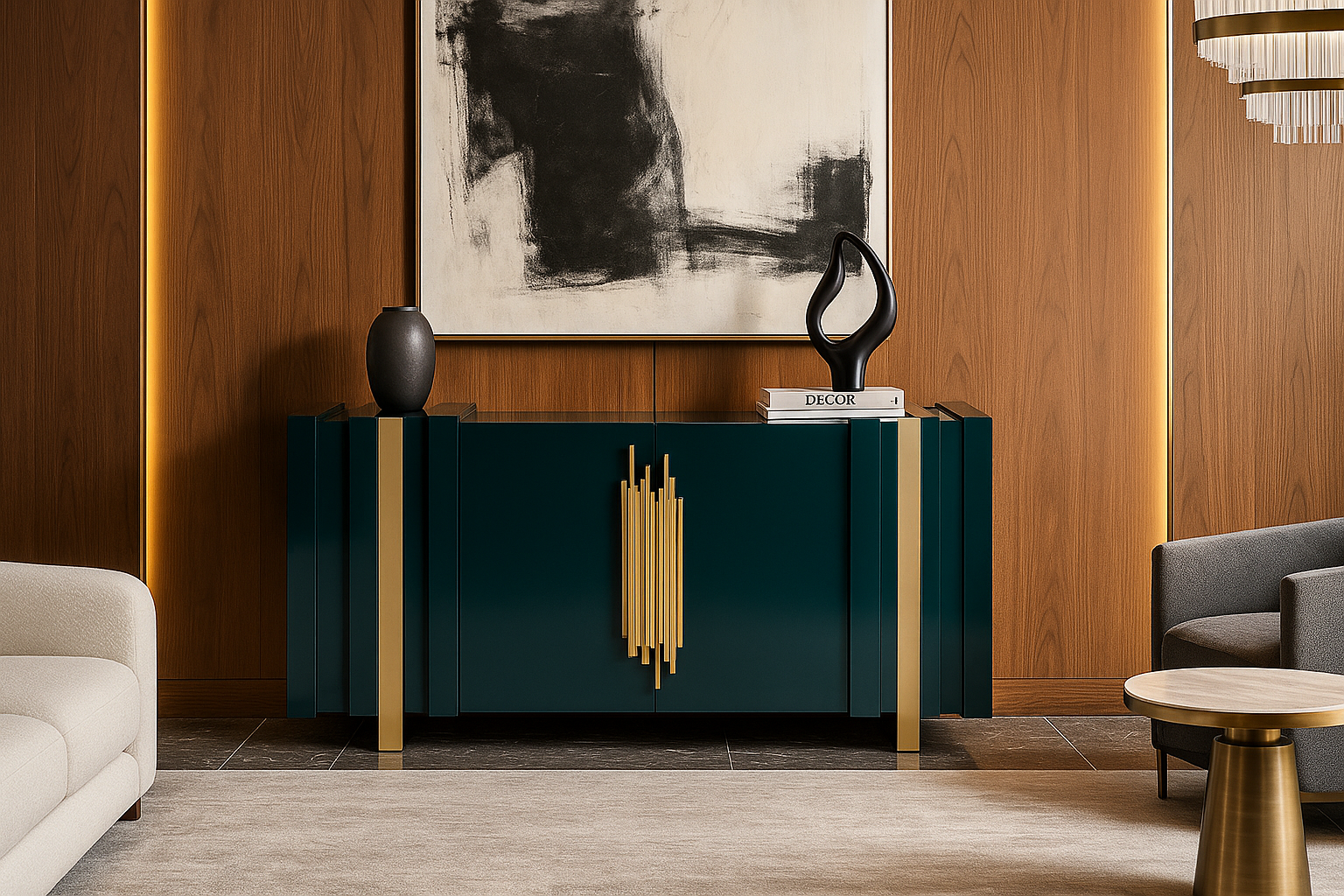Discover the Echelon Verde Chester, a sculptural green cabinet with bold golden detailing. A statement of modern luxury and refined storage.