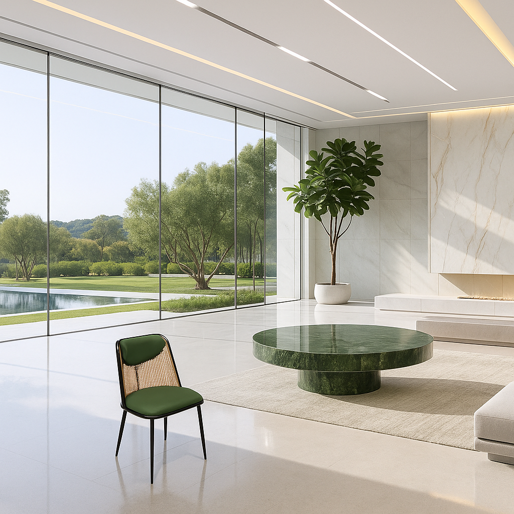 Green chair with cane backrest, sleek black frame, and timeless design — blending modern minimalism with artisanal warmth.