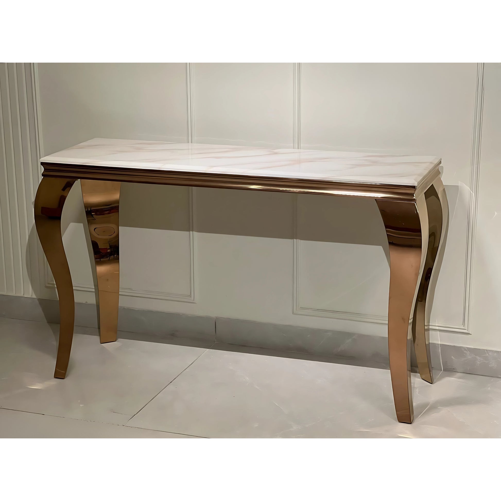 Luxury rose gold console table with marble top — a refined statement piece for hallways, foyers, and living rooms. Elegant design by TAS Living.