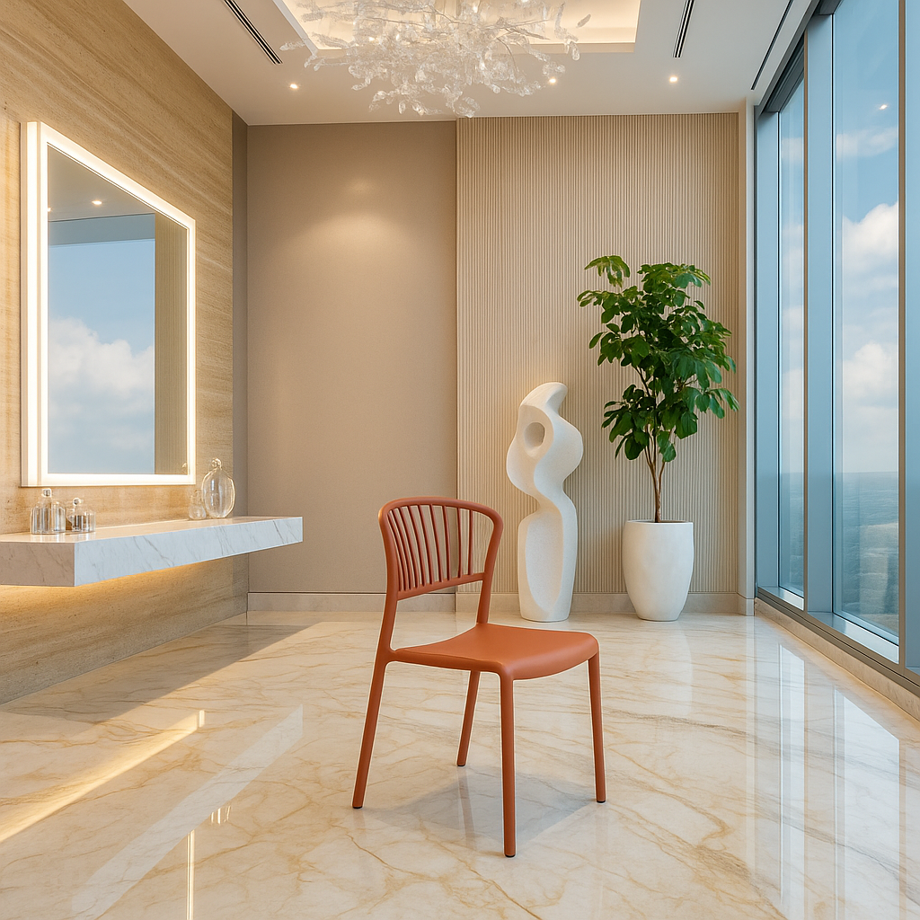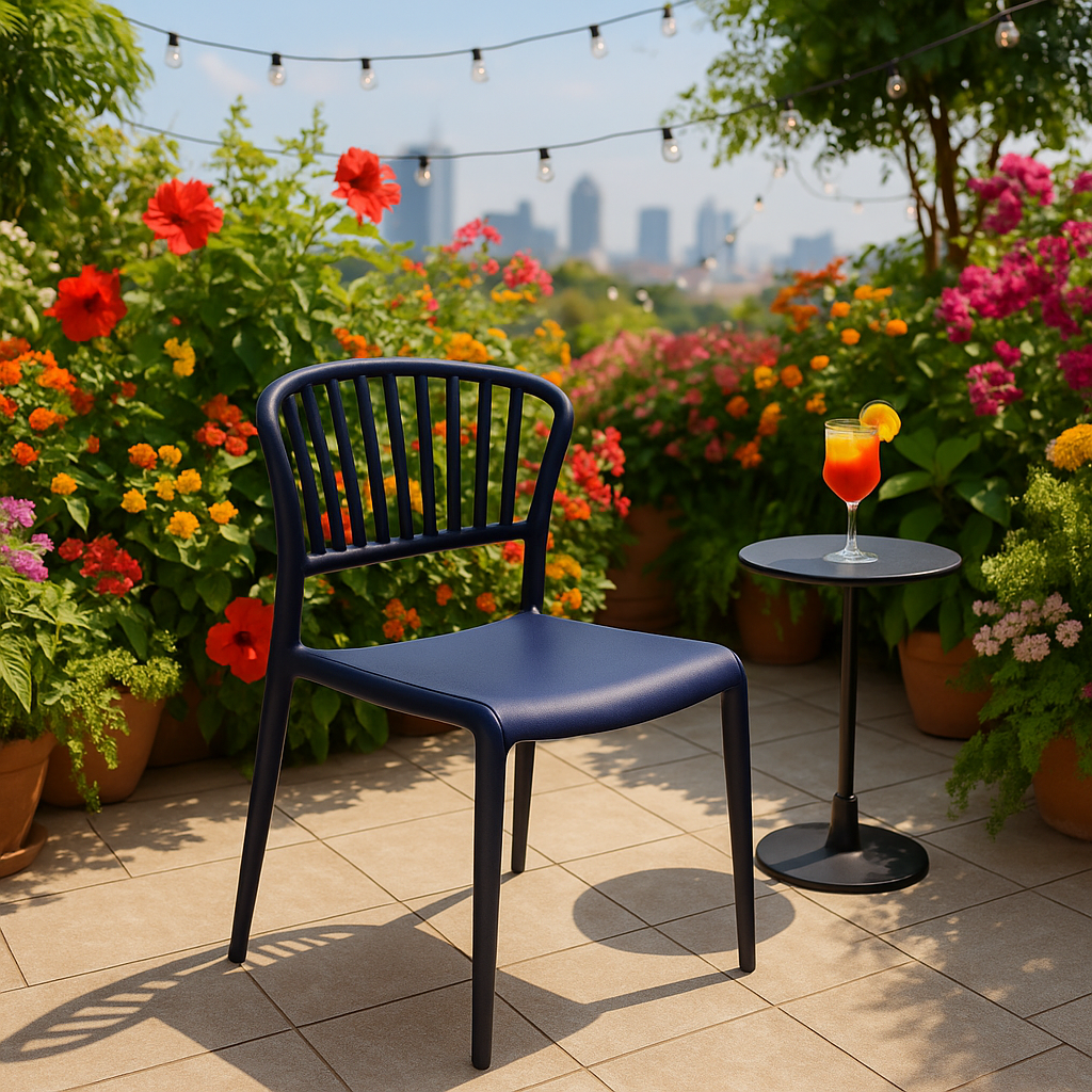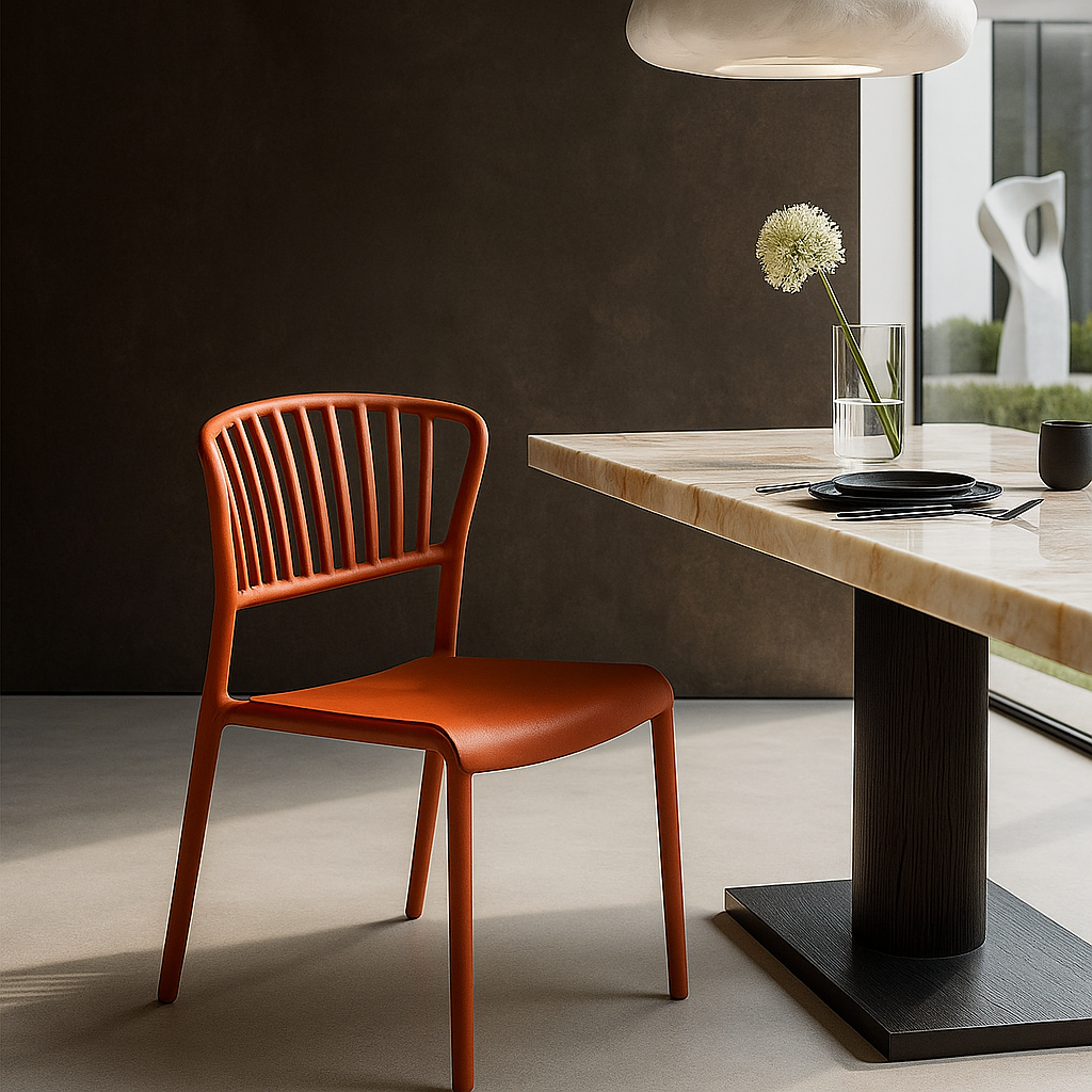 Modern purple dining chair with slatted backrest. Sleek, versatile, and lightweight design perfect for dining, café, or balcony spaces.