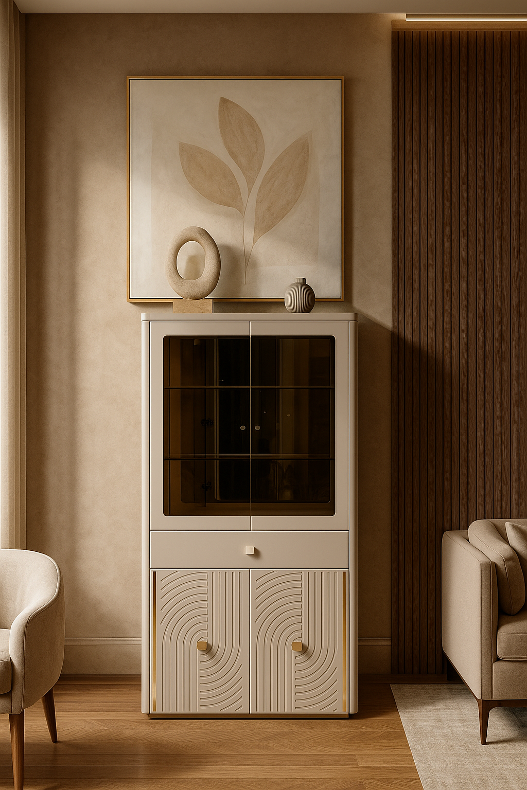 Luxury display cabinet in ivory with glass doors, golden accents, and hidden storage. Perfect for elegant dining and display.