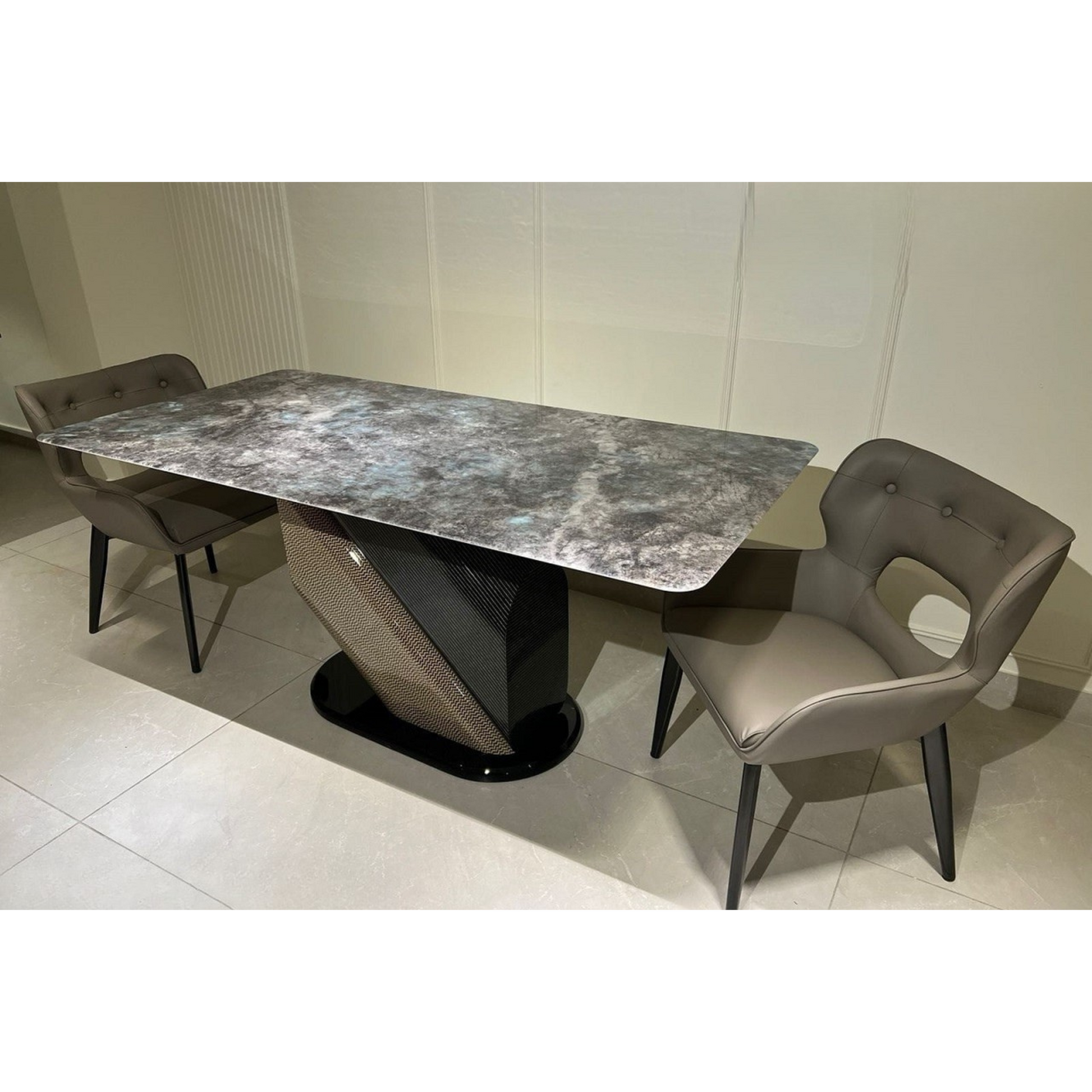 Luxury dining table with geometric pedestal and marble-finish top. A bold, modern statement piece for sophisticated interiors.