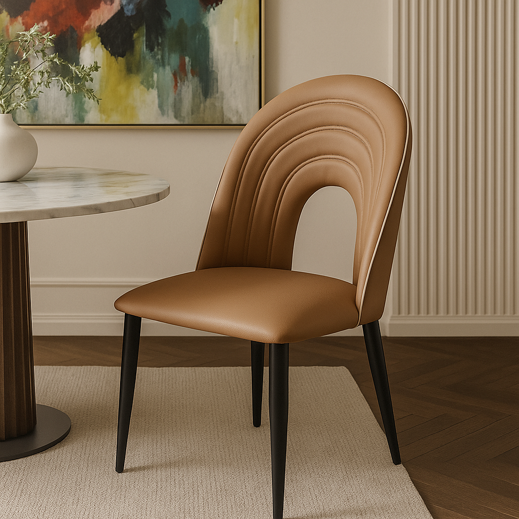 Luxury camel leather chair with arched backrest stitching and sleek black legs — perfect for modern dining or accent seating.