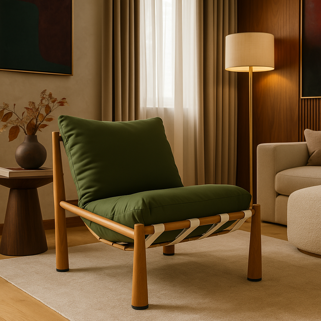 The Forest Leisure Lounge Chair features a sturdy wooden frame with a unique suspended base created by white webbing straps. It holds two plush, detachable green cushions, blending natural warmth with modern design for a cozy feel.