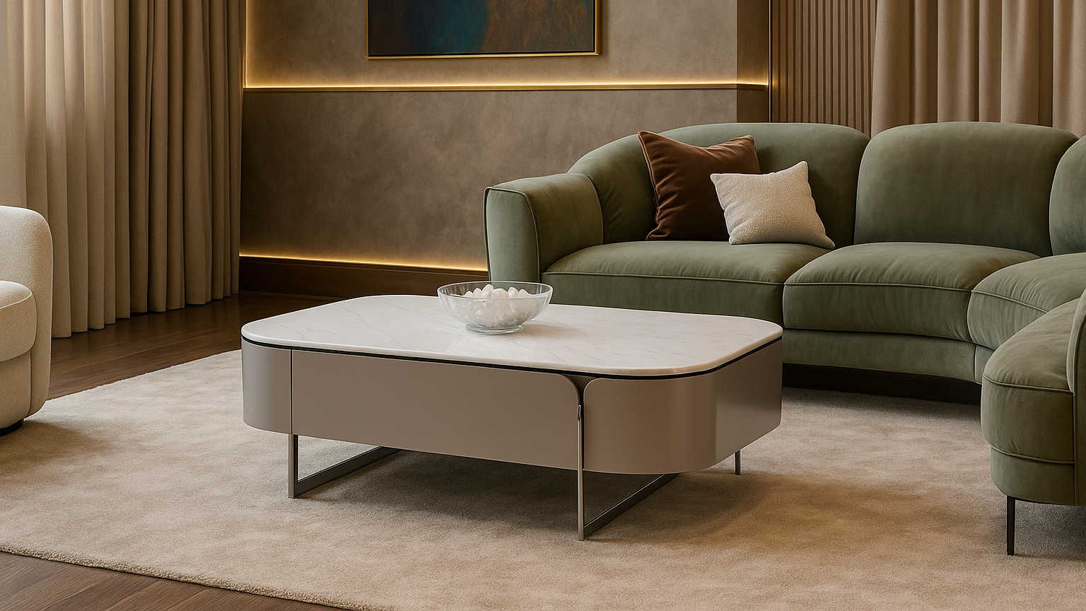 Modern taupe center coffee table with white marble top, curved corners, and sleek chrome legs — refined luxury for contemporary living spaces.