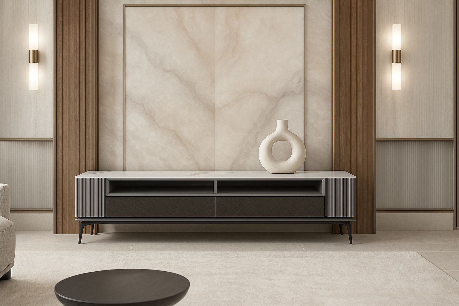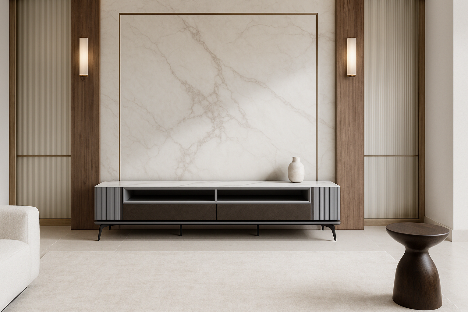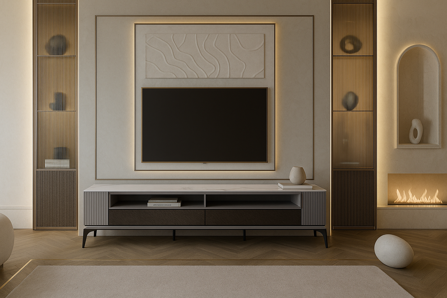 Discover the Nivara LED Runner. A luxury LED TV unit with marble top, fluted panels, and sleek storage for modern interiors.