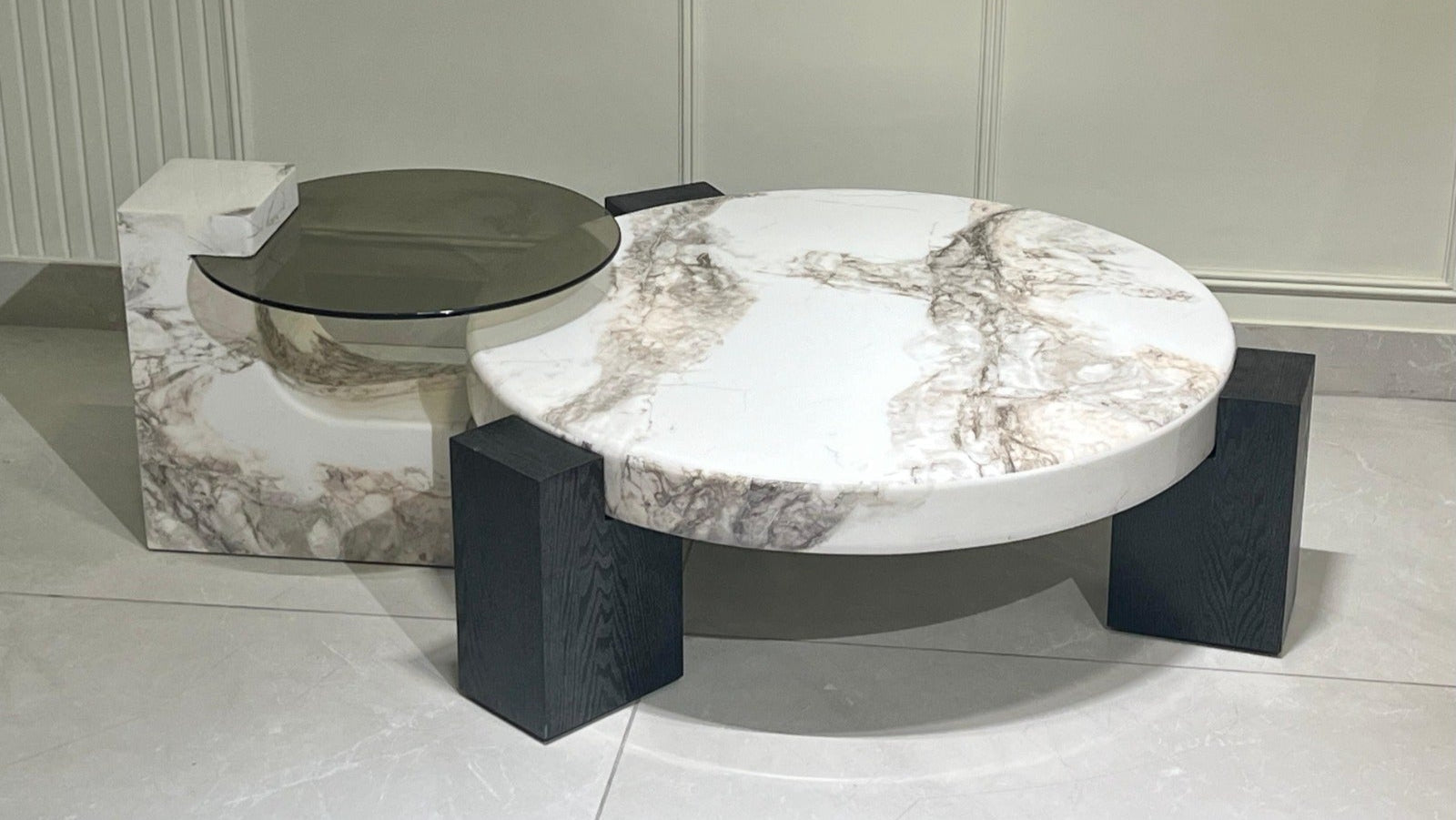 Sculptural center coffee table set in marble, stone, and smoked glass—crafted for refined luxury interiors with modern contrast.