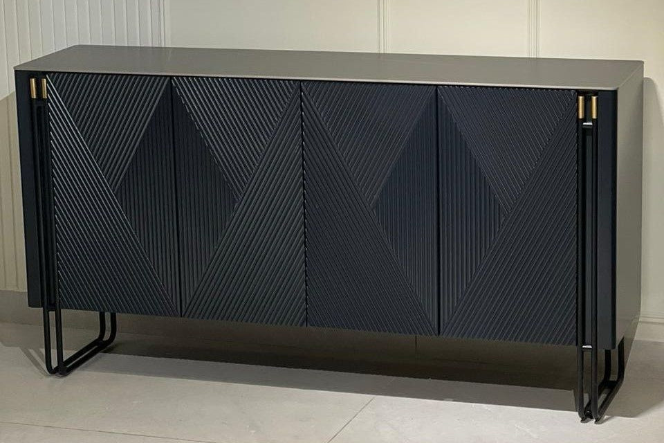 Discover the Obsidian Strata Chester — a luxury geometric grey cabinet with bold fluted design, golden accents, and refined modern elegance.