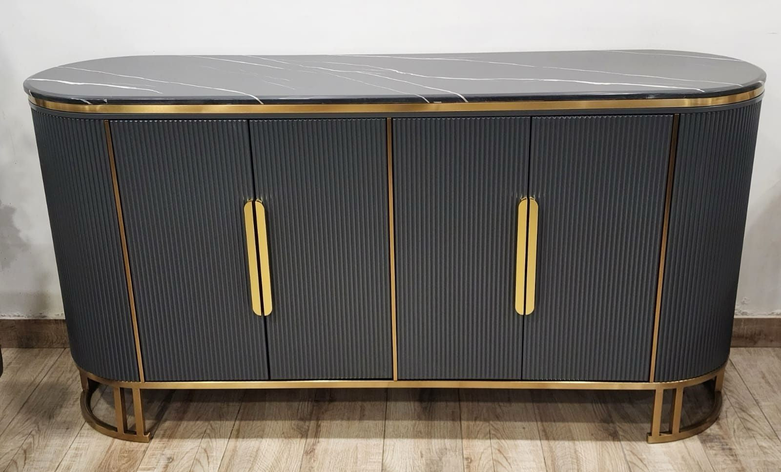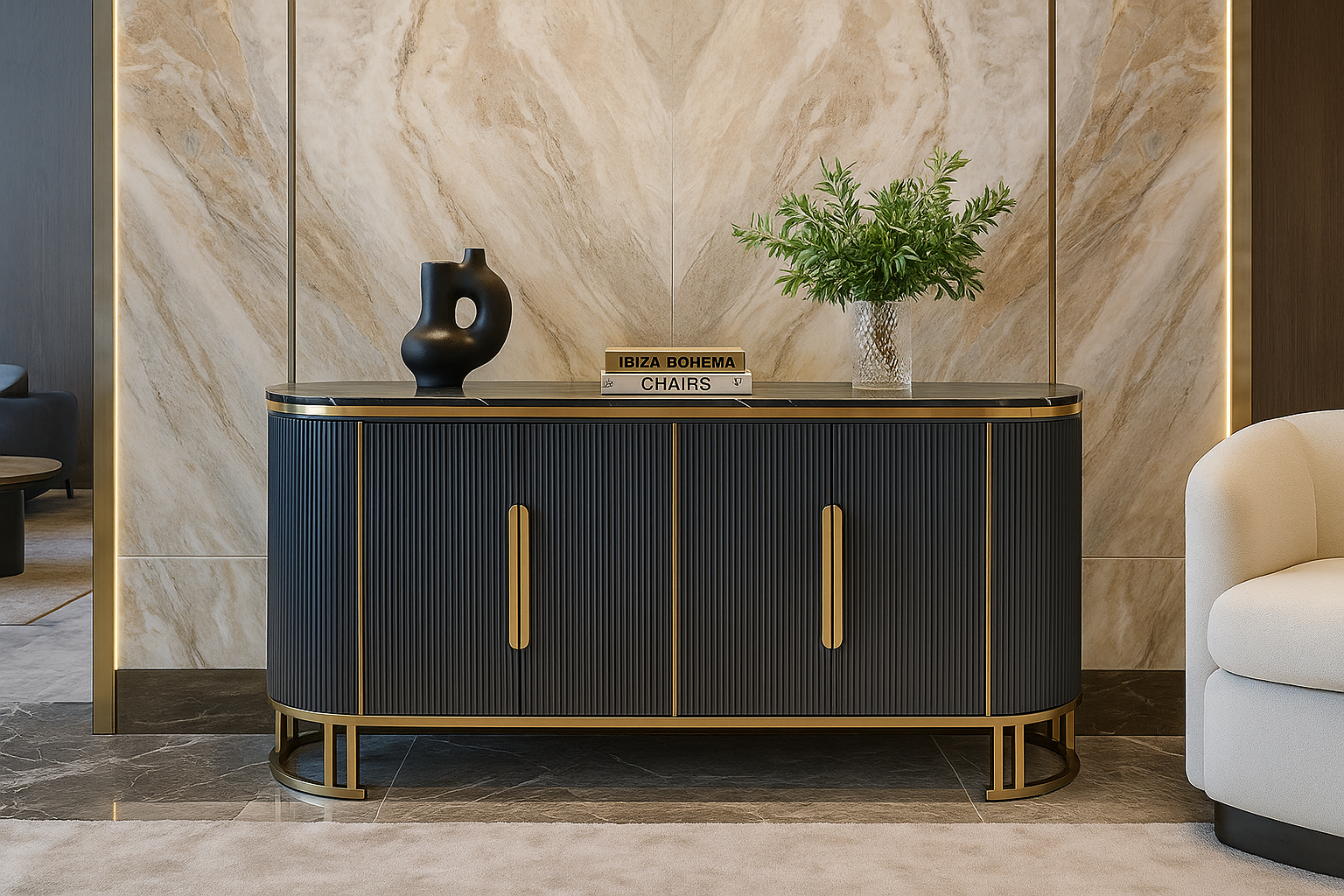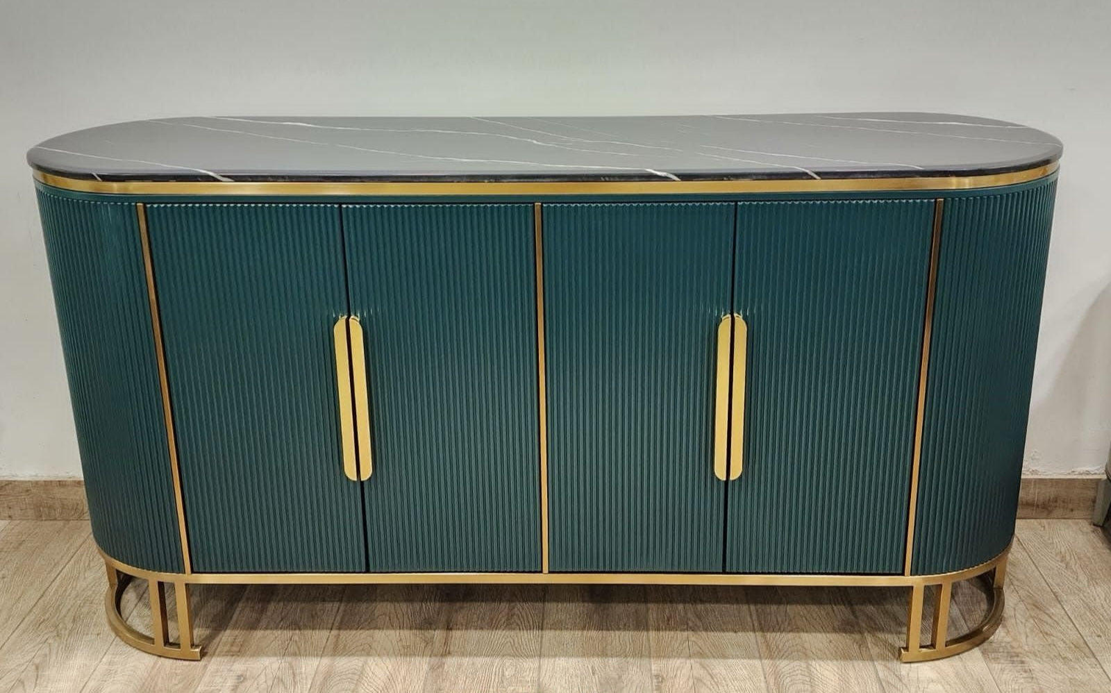 Elevate interiors with the Granvia Luxe Chester — deep green fluted panels, gold accents, and a grey marble top for timeless luxury.