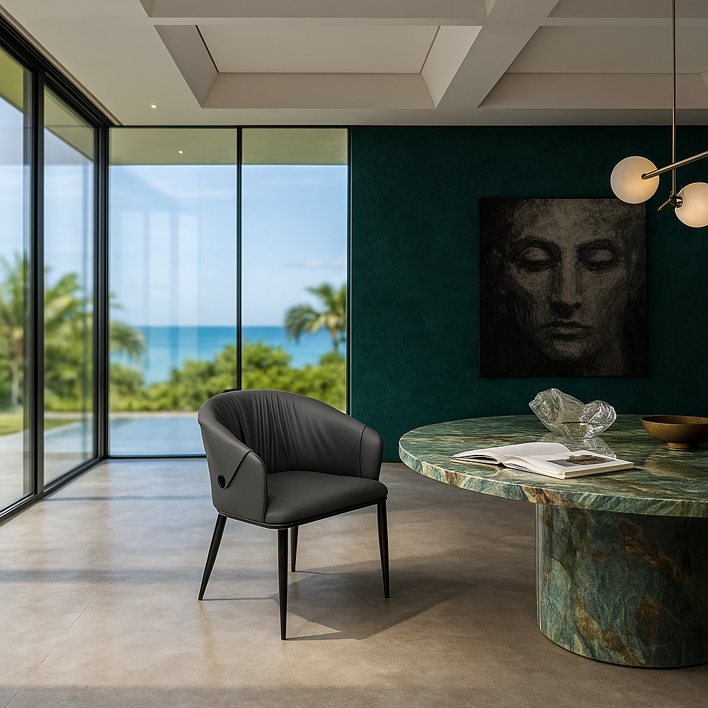 Cocoa Drift Dining Chair in rich brown faux leather with sculpted backrest and black legs — a refined blend of softness and modern form.