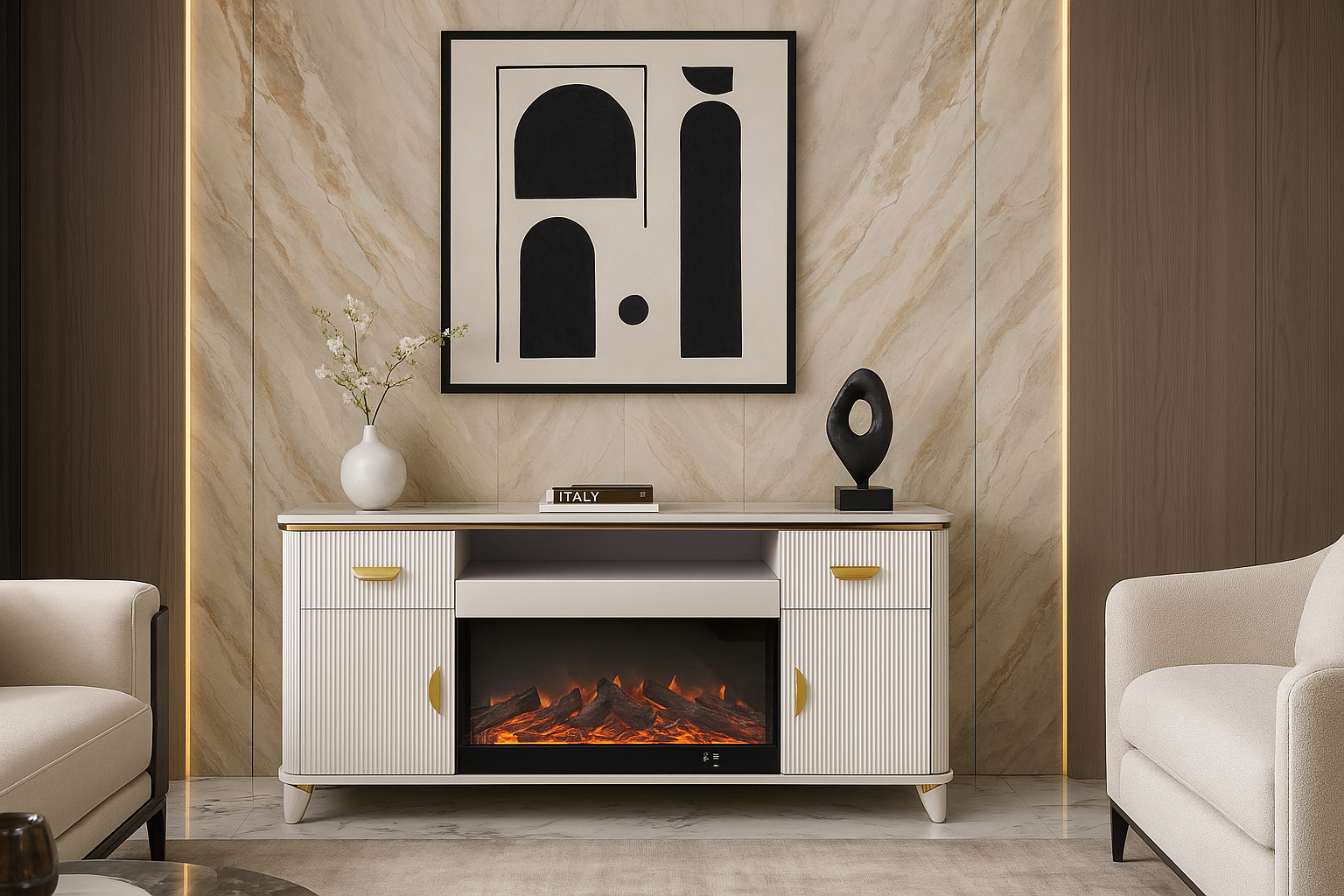 Elegant fireplace cabinet with marble-effect top and gold accents. Luxury storage console with built-in fireplace for modern living rooms.