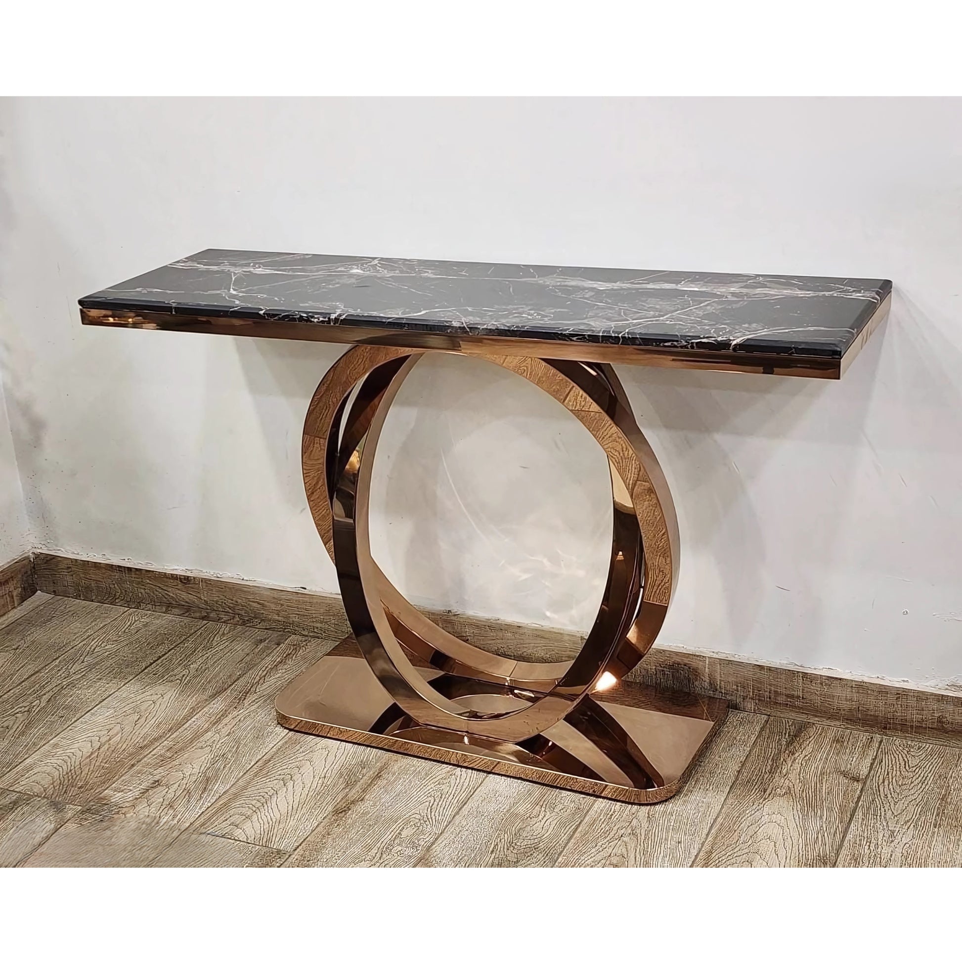 A striking black marble console table with signature gold looped legs, ideal for luxury foyers, hotel lobbies, or executive offices.