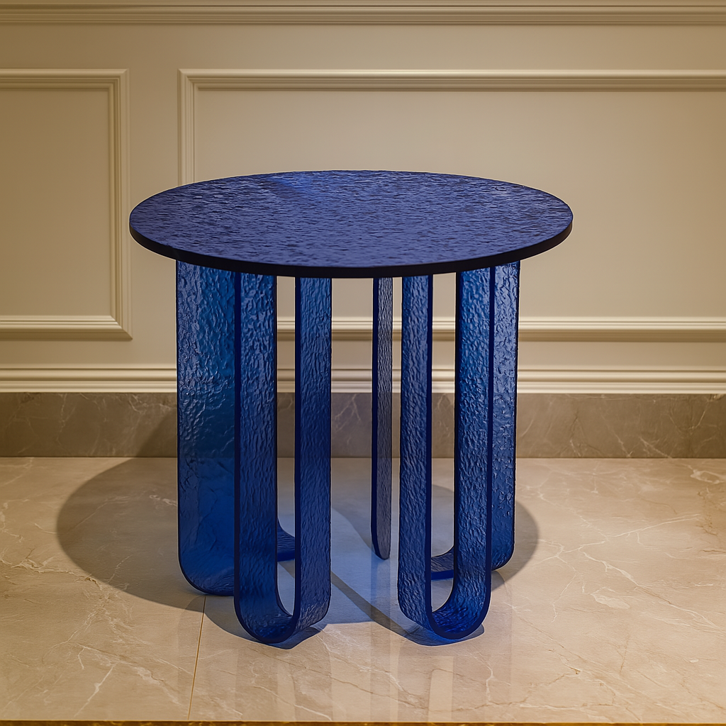 This modern Azure Ripple Side Table features a rich, deep blue textured glass construction with a smooth round top and unique sculptural legs. A perfect fusion of art and function, it’s ideal for adding a bold, luxurious touch to contemporary living spaces.