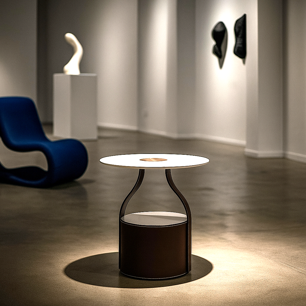 A Vesel Accent side table with a round, marble-patterned top and a central gold accent. Its unique orange frame curves to form a spacious, integrated storage bin at the base.