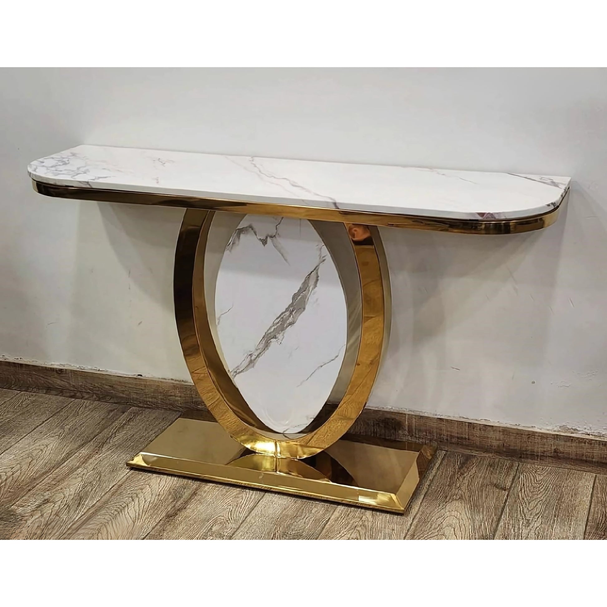 A striking black marble console table with signature gold looped legs, ideal for luxury foyers, hotel lobbies, or executive offices.