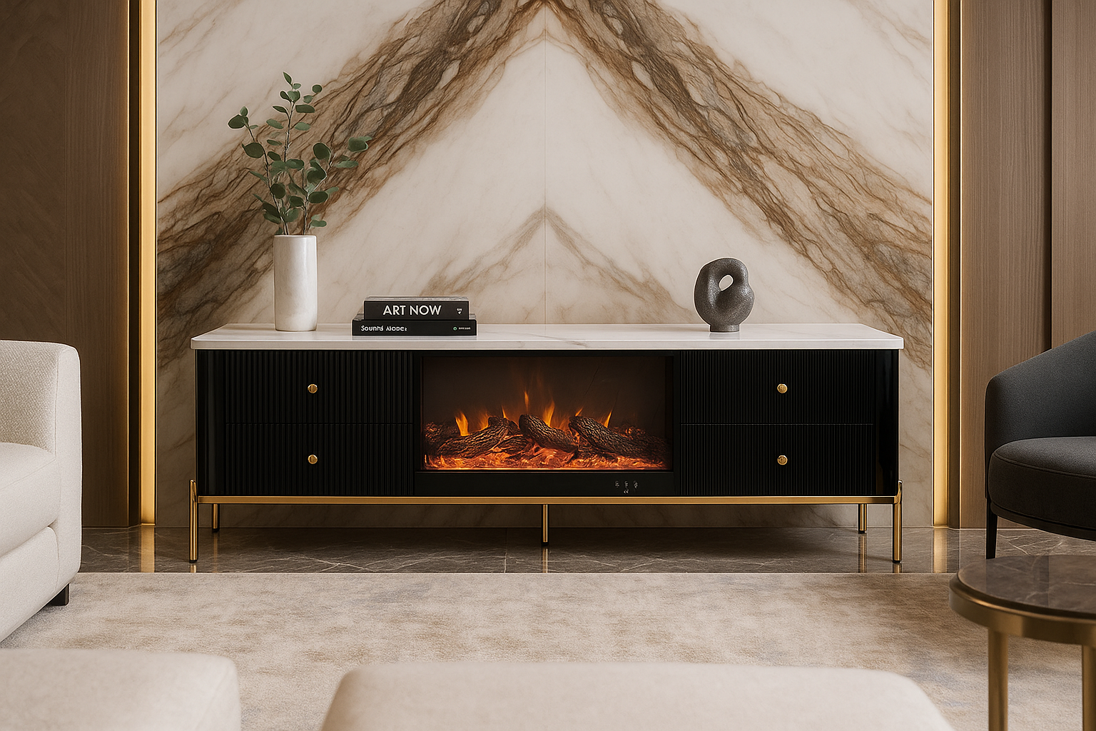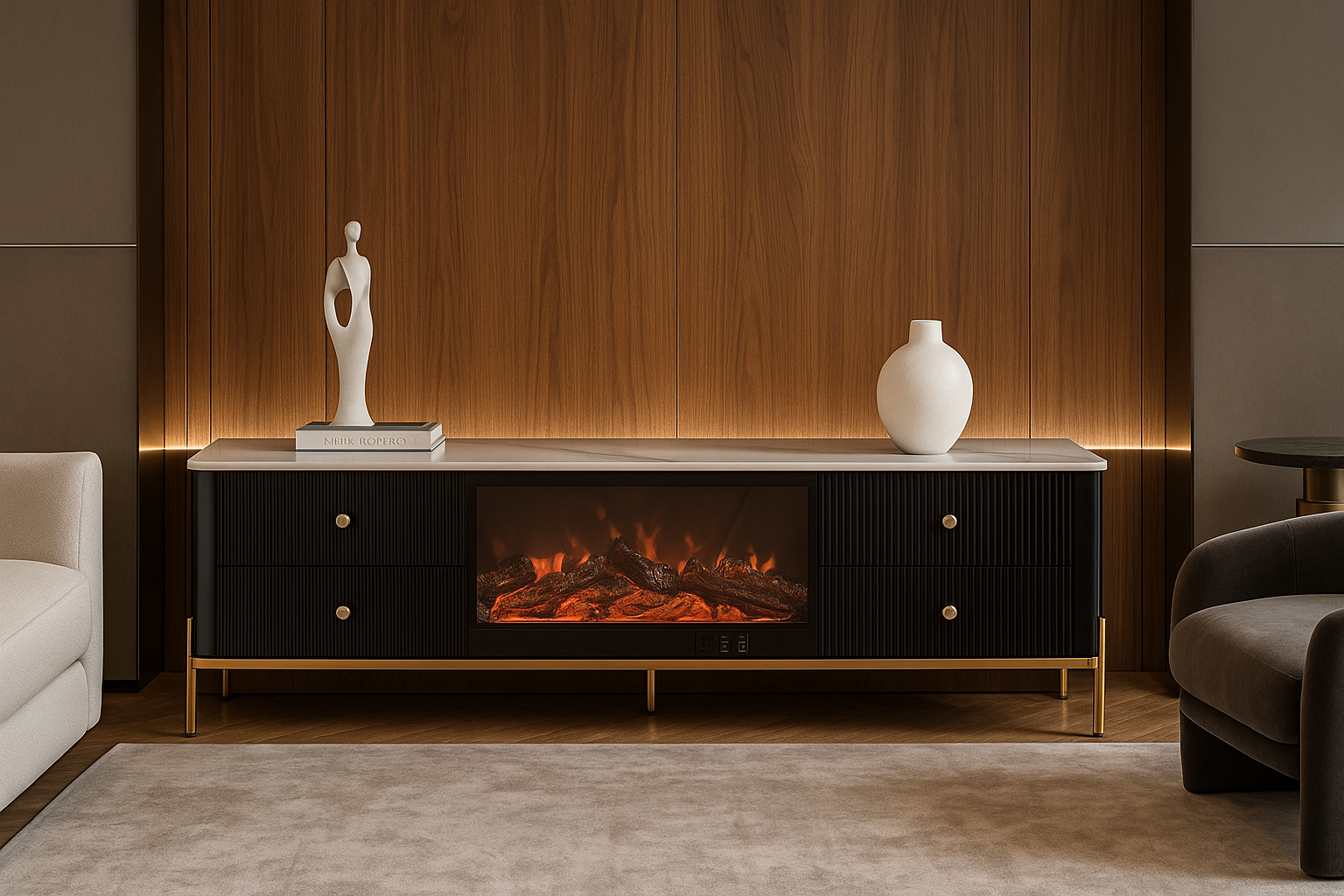 Noir Flame LED Runner with black ribbed drawers, golden accents, and fireplace effect — a modern luxury TV console for statement interiors.