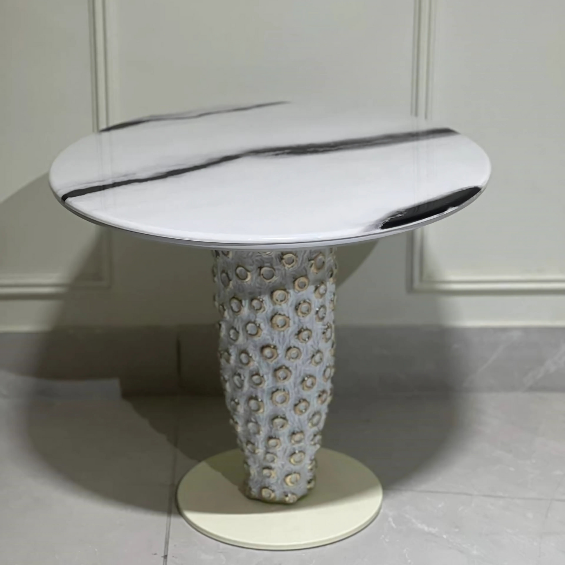 An elegant Pearl Crest Marble Side Table with a sculptural designer pedestal base — perfect for adding luxury and artistic charm to any modern space.