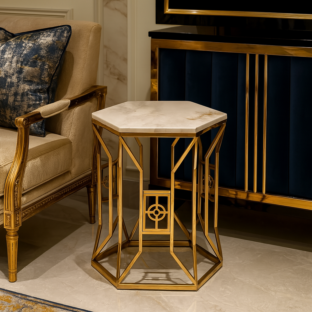 Elevate your space with this Hexagen shape luxury side table featuring a premium marble top and a sleek metal base — the perfect blend of elegance and function for refined interiors.