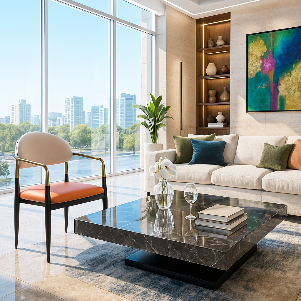 Luxury dining chair with brass armrests, black legs, and dual-tone beige-orange seat. A bold yet refined statement for modern interiors.