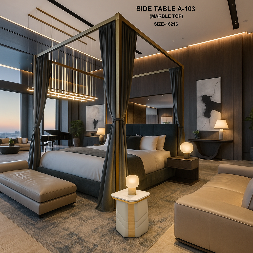 Vogue Axis Side Table – Modern side table with white marble top, quilted leatherette base, and gold accents. Perfect for luxury interiors.