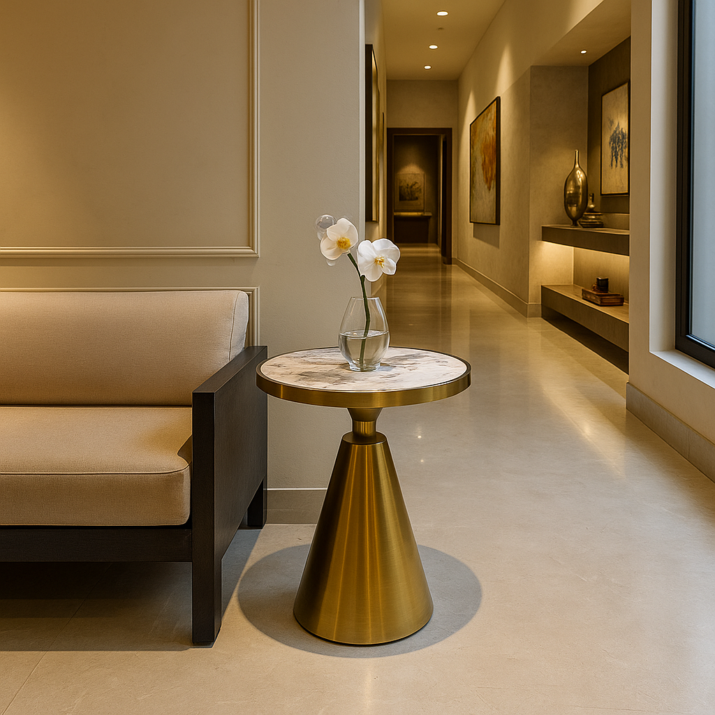 A sleek and Imperial Pulse Side Table with a rich black marble top accented by golden veins, sitting on a conical brushed gold base—perfect for luxury interiors and contemporary aesthetics.
