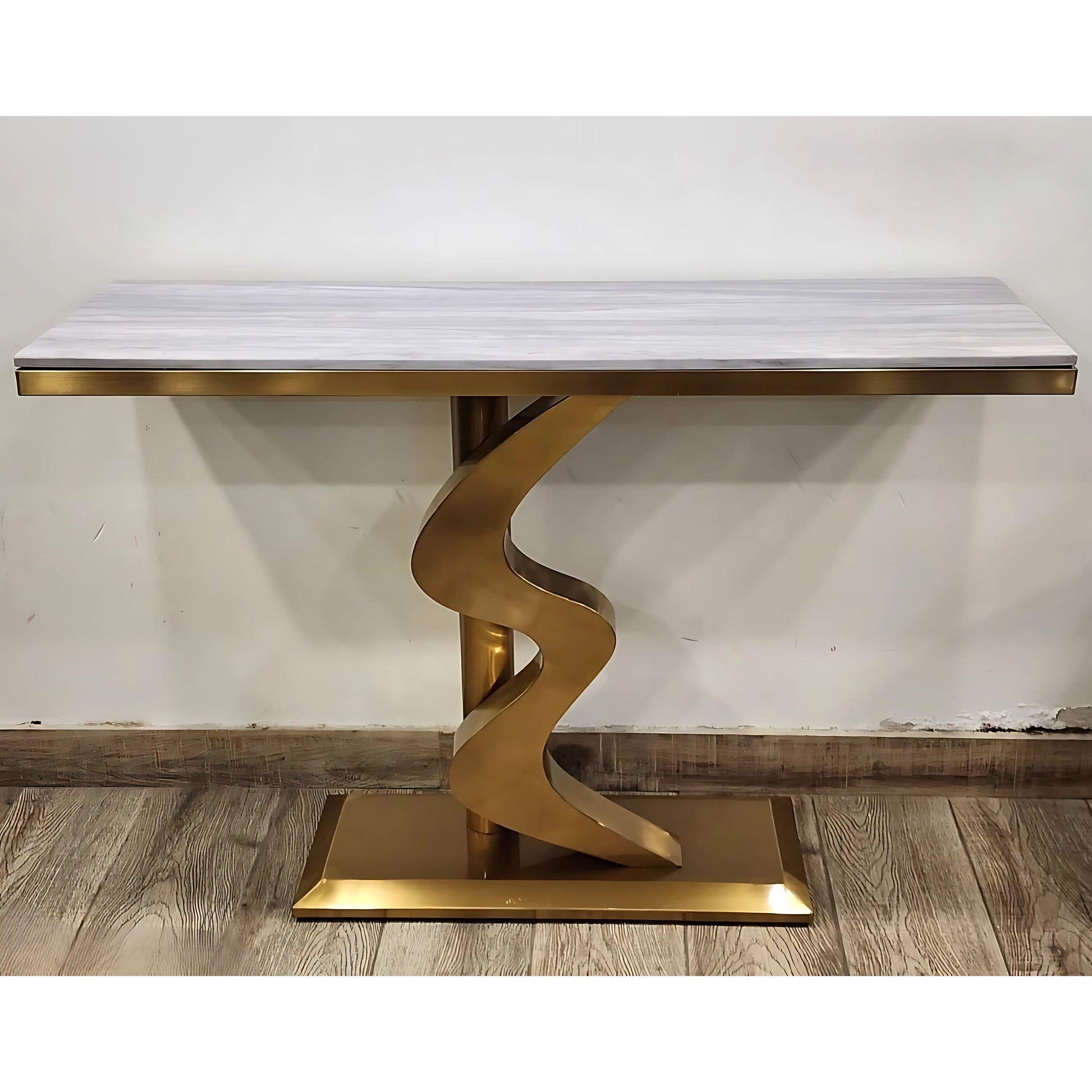 A striking black marble console table with signature gold looped legs, ideal for luxury foyers, hotel lobbies, or executive offices.